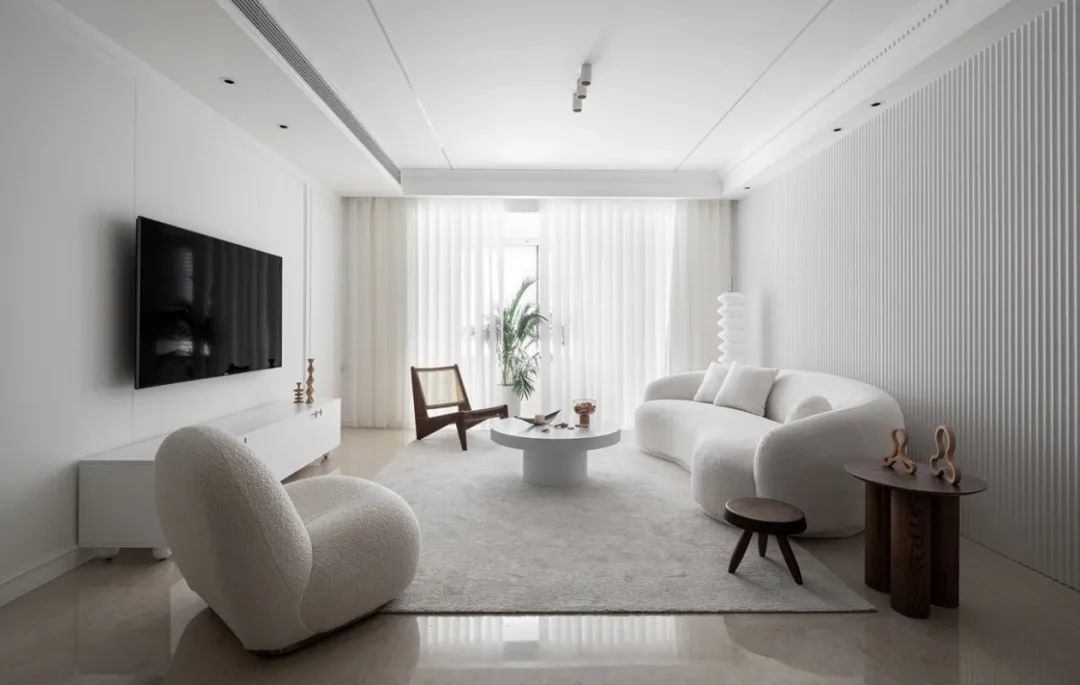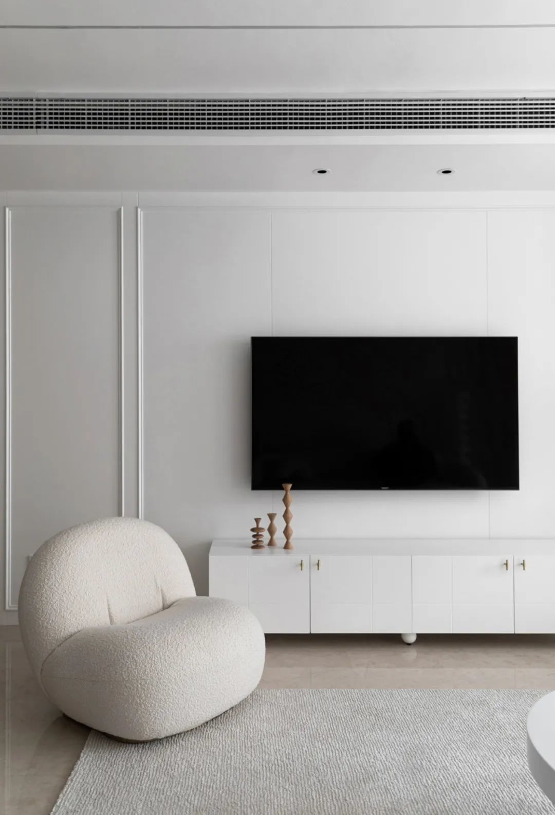 ▲沙发墙以白色长城板为装饰背景,摆上外形带有弧线的优雅米白色沙发,结合白色圆形茶几,地面铺设浅灰色布艺地毯,整个空间都充满了简雅高级的气质。
