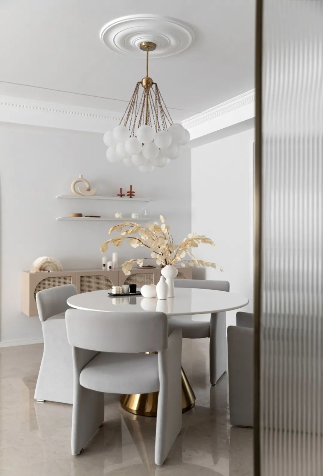▲餐厅与客厅保持一种的淡雅色调,左侧装上一个悬空的木色餐边柜,布置精致优雅的装饰画,带来一种精致优雅的氛围感;中间布置金属脚架的大理石台面餐桌,结合灰色皮艺餐椅,也让用餐空间显得实用华丽又端庄。