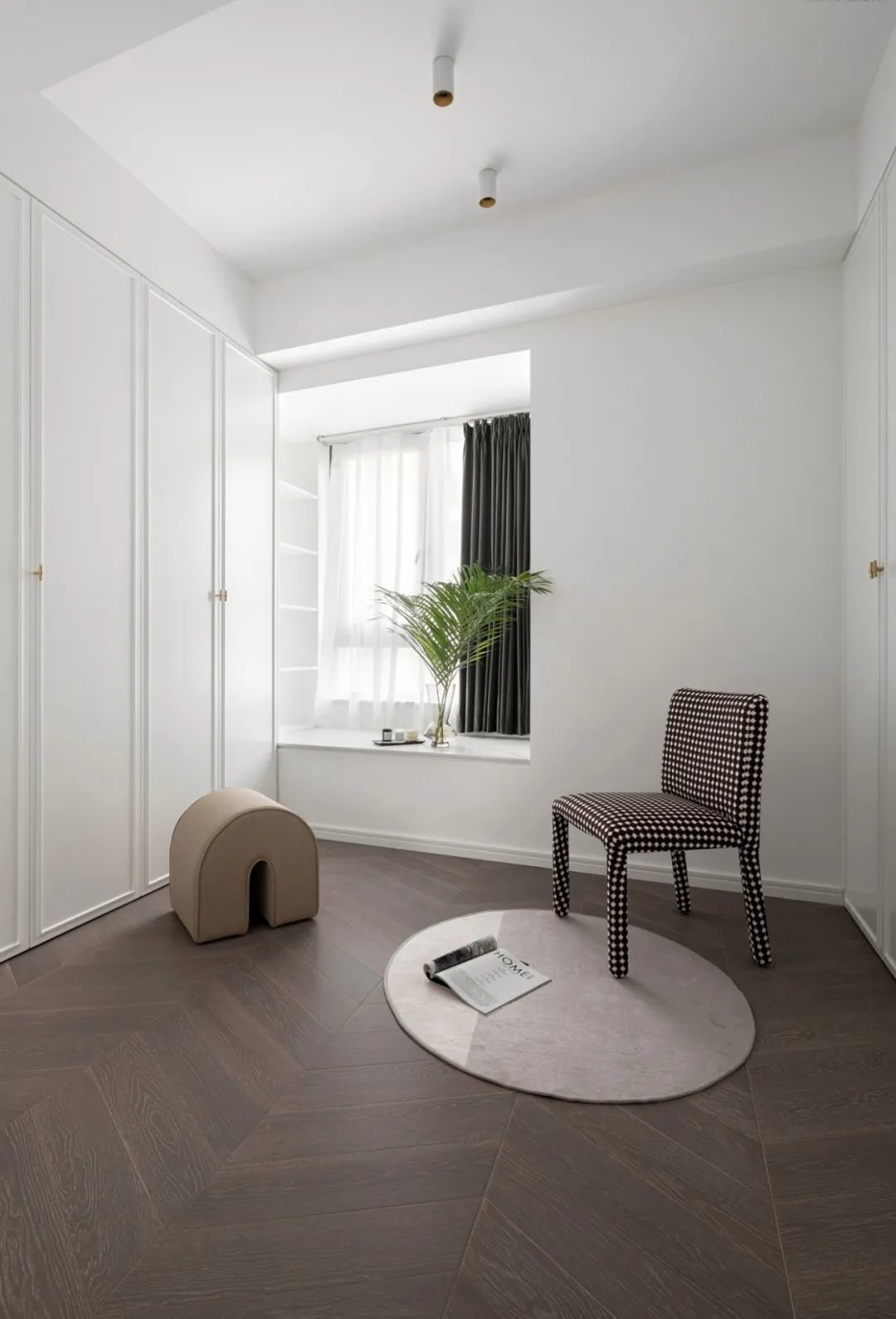 ▲次卧空间定制一排衣柜,地面是鱼骨铺的木地板,摆上休闲凳、地毯,飘窗上布置摆饰品与花瓶插花,让次卧也显得精致清新而优雅。