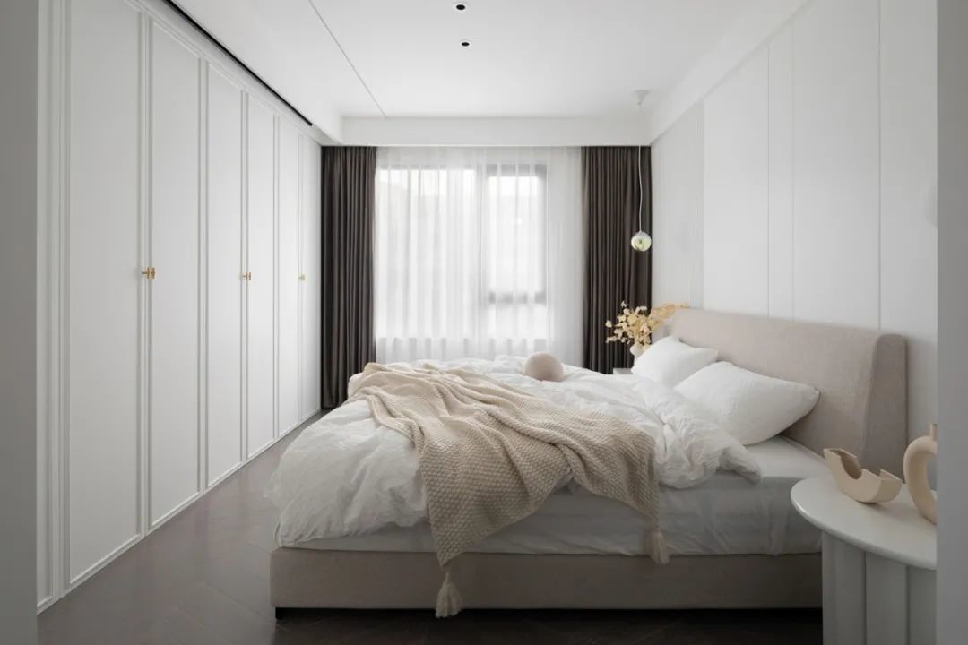 ▲米黄色布毯放在床上,在净白的空间,营造出一种淡雅舒适的氛围;床尾一整排的衣柜,并在天花加入电动幕布,为主人提供了更加轻松优雅的卧室休闲体验。