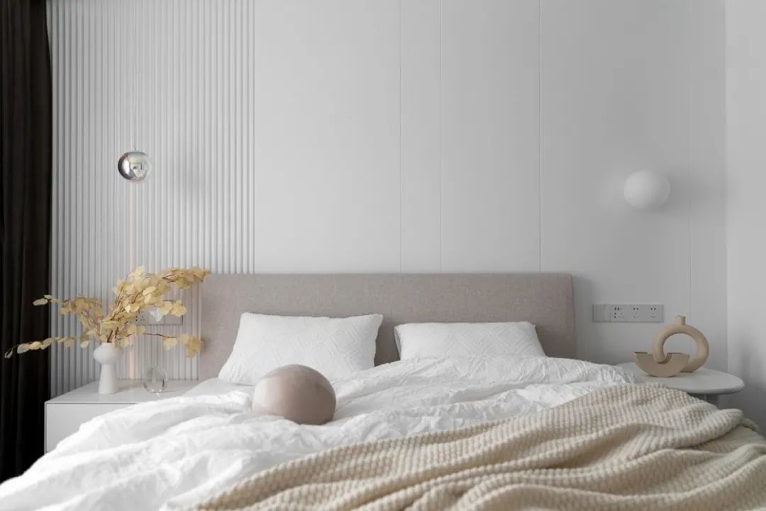 ▲床头墙左侧布置花瓶与银色吊灯,右侧加入独特的摆饰品与白色球形壁灯,中间布置卡其色的床头靠背,布置洁白的床单枕头,让卧室显得简洁优雅而舒适。