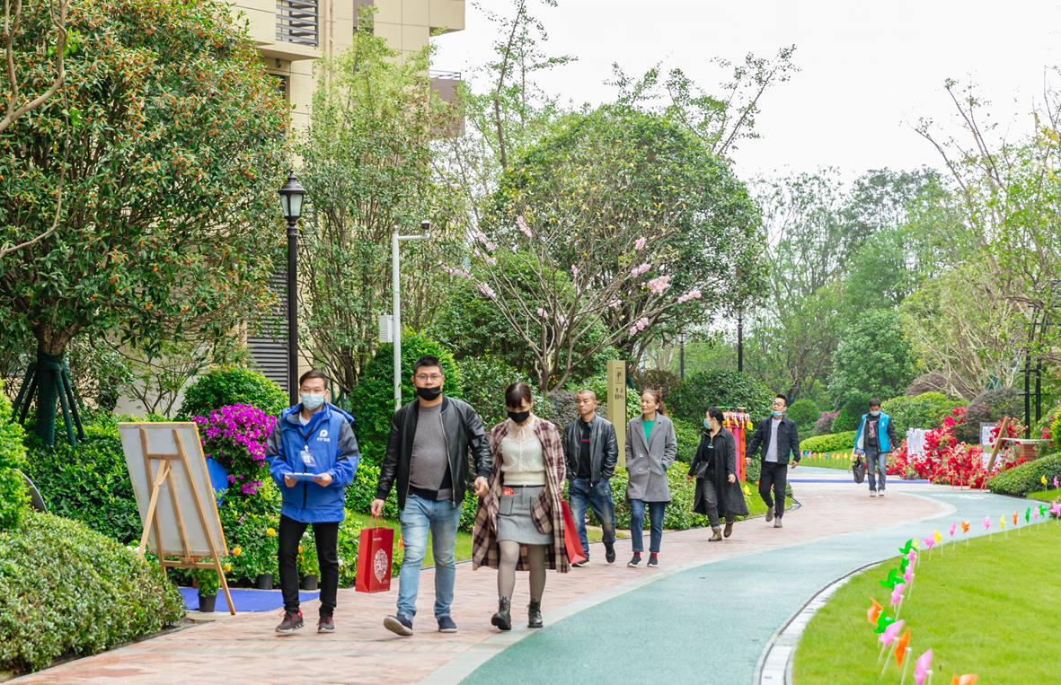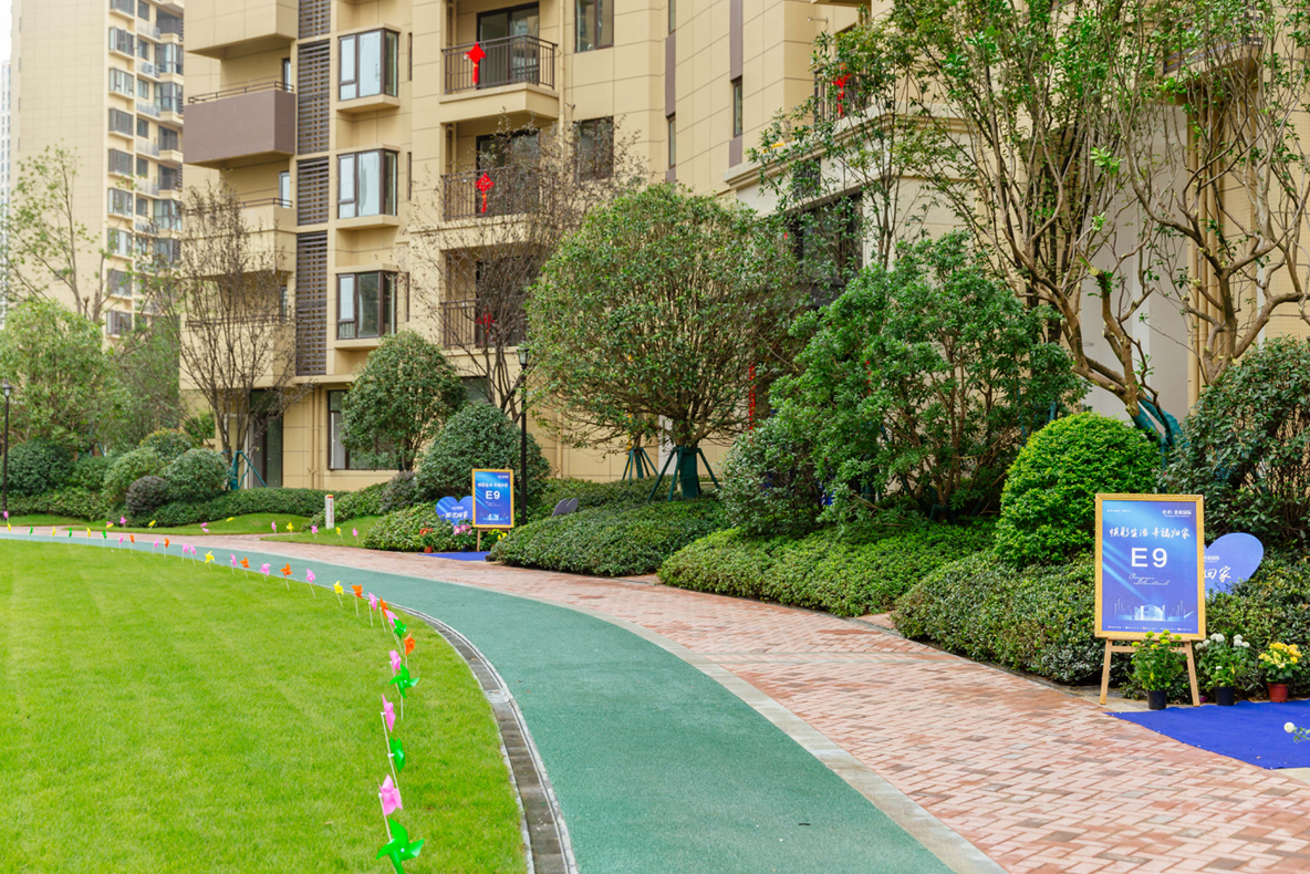 虽然已经进入了深秋,但小区内依然满眼绿色,随处可见大片草坪、观赏灌木,园林内的草地上也插上了彩色风车,每一户挂上了红色中国结,大堂处贴上了“欢迎回家”的红色字样......,小区内尽显喜气。