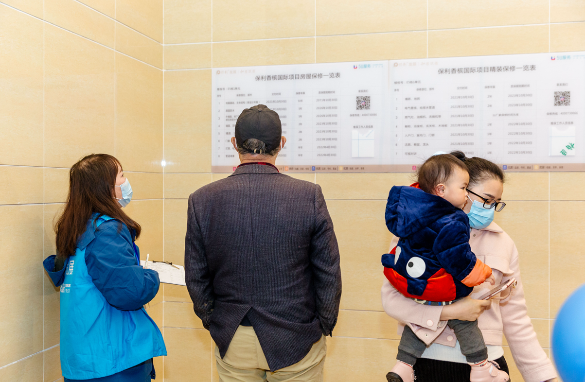 大堂处还展示了保利物业服务信息和服务人员的信息,精装修标准和用材也在现场进行了公示。另外,交付现场保利香槟国际还为收房的业主准备了收房礼和剪彩仪式,仪式感满满。
