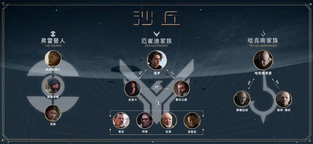 片中角色主要分为三个阵营,厄崔迪家族 (主角方) 、哈克南家族 (反派) ,以及沙丘里的原住民弗里曼人。