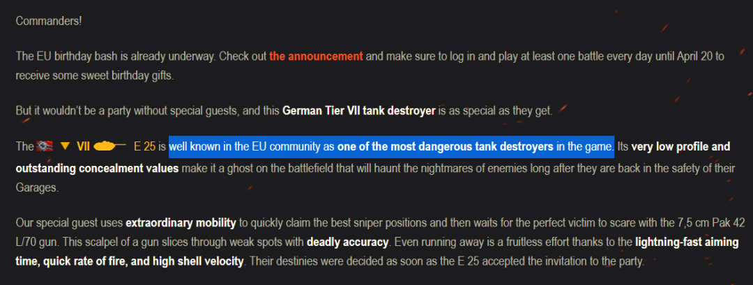 其实除了E-25和“超级地狱猫”之外,别的车WG基本都是敞开了卖,“超级地狱猫”是老兵奖励可以理解,但E-25这家伙,WG是真的拼命地藏着掖着,因为像这种非常破坏平衡的超强力小车现在WG是非常不愿意发放的。就像不四不五、A/V黑豹、AMX 1357等车一样,事实性绝版。这车不是没有,也不是不存在,就是现在WG不愿意卖。以E-25为例,直营服一般是一年卖一次,还都是挑个特别好的由头(重大纪念日)之类的,就卖几天之后光速下架。好在老国服时期的特殊情况方便了玩家们,只要手上有这几台车的,那就偷着乐吧。我是阿纳贝尔丶卡多,永远为咱玩家的切身利益着想。如果您喜欢我的车评,还请转发分享宣传,让更多的车长们回家。