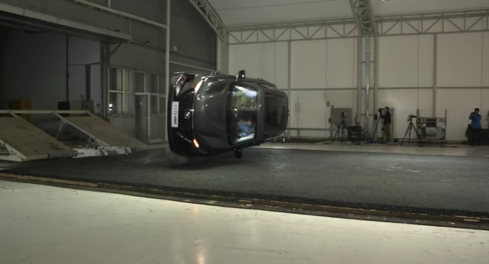 关键还不在这儿,75P的这场翻滚试验采用了55km/h的测试速度,比美国标准的48.3km/h的时速标准还高出了一大截,这也是国内首次有车辆挑战这一速度。肯定不是闹着玩呢,速度的增加,车辆滚起来肯定更剧烈。比美国标准还高,这直接挑战车辆的安全极限了。