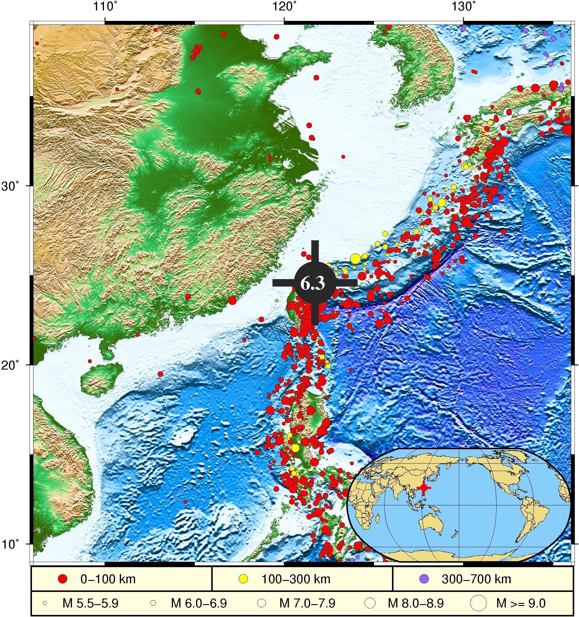 国家海洋预报台今天发布,2021年10月24日13时11分(北京时间),中国台湾地区海域(24.58 N,121.72 E)发生6.3级地震,震源深度为39.2千米。自然资源部海啸预警中心根据初步地震参数判断,本次地震不会引发海啸。(总台央视记者 李卉 李洁)