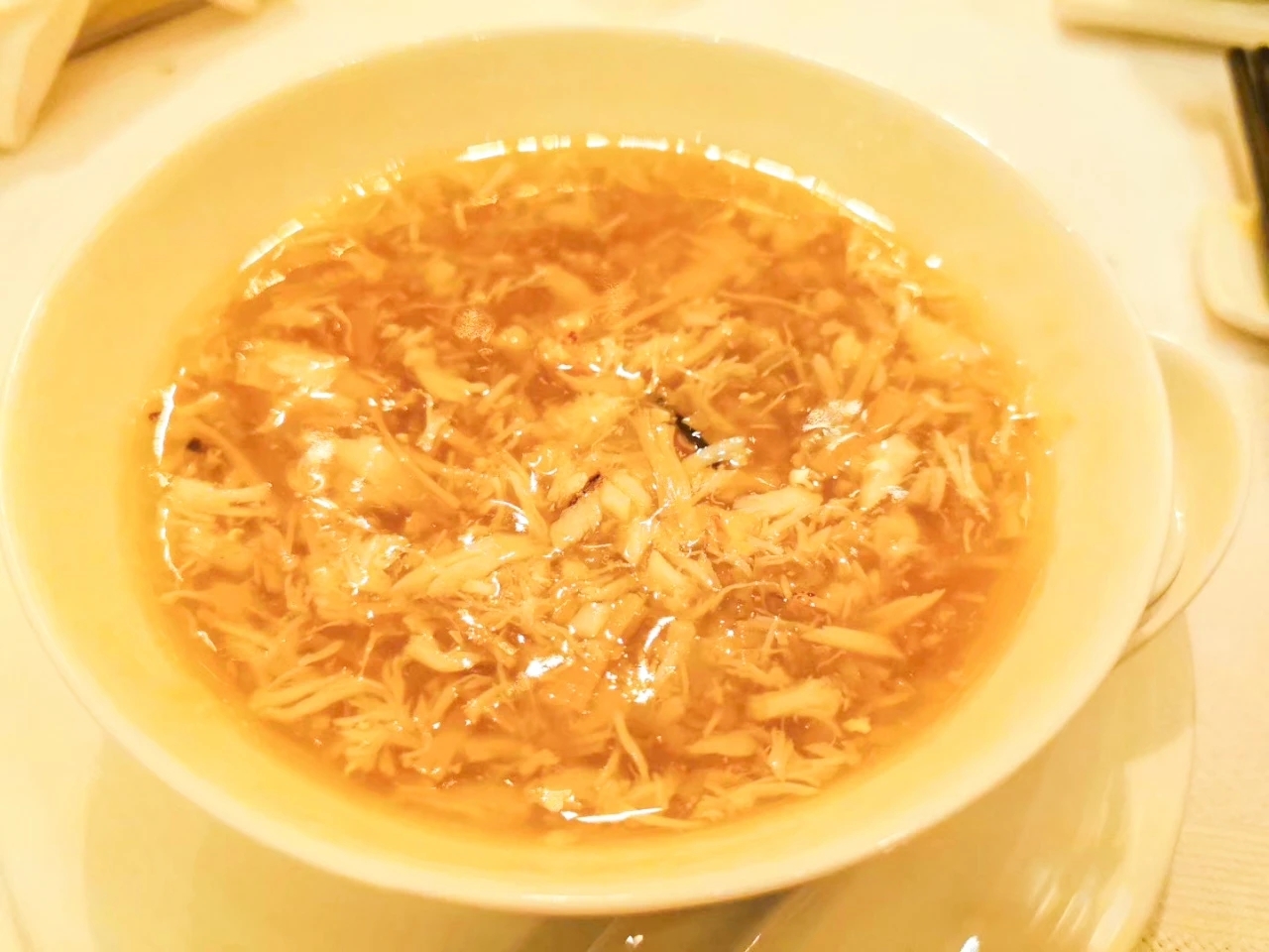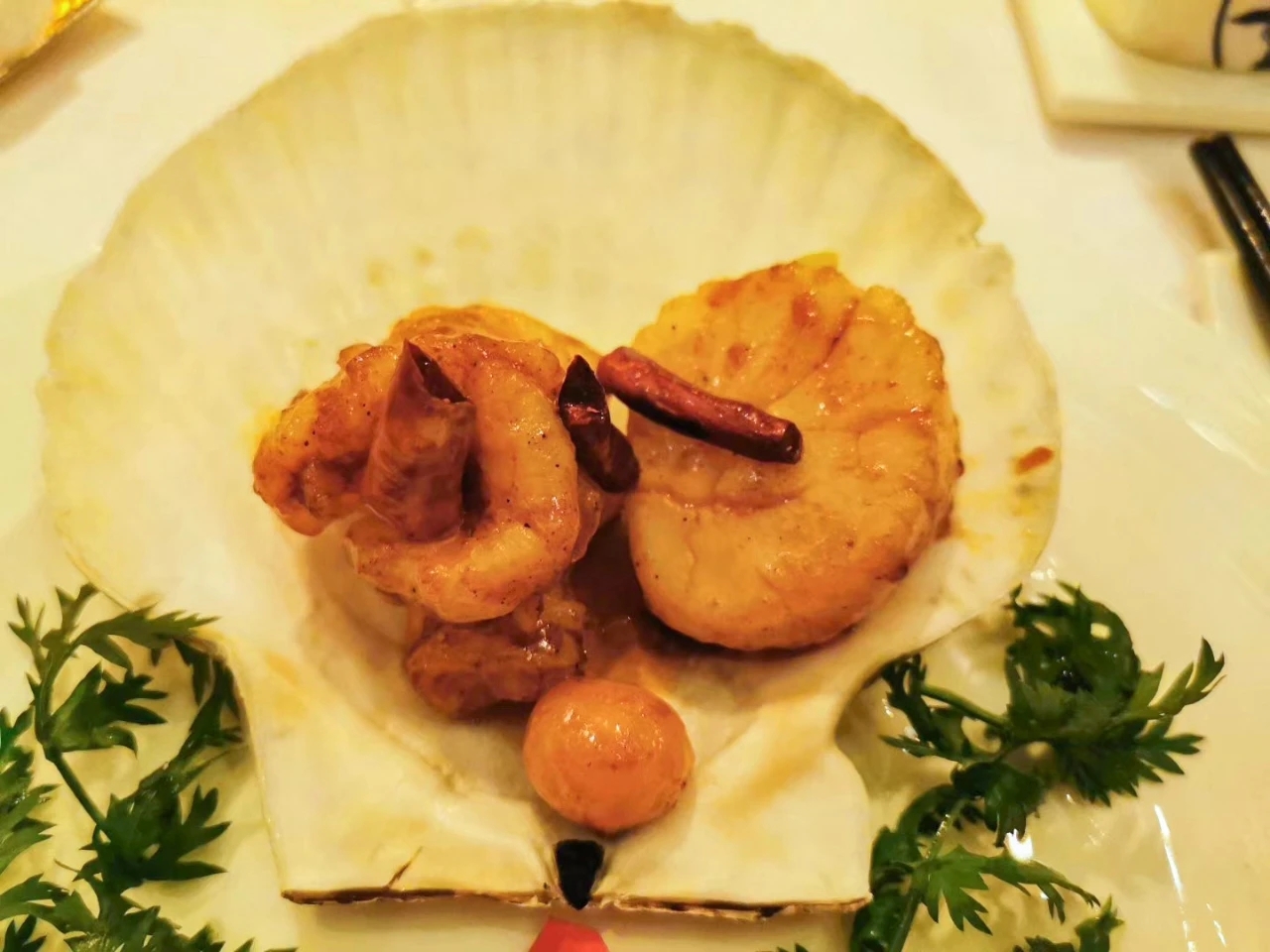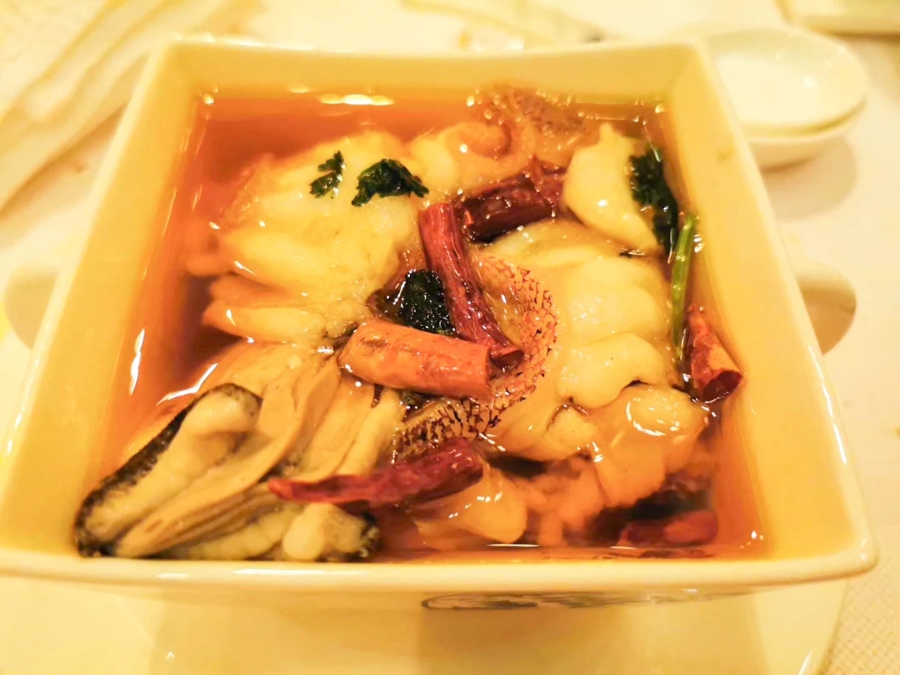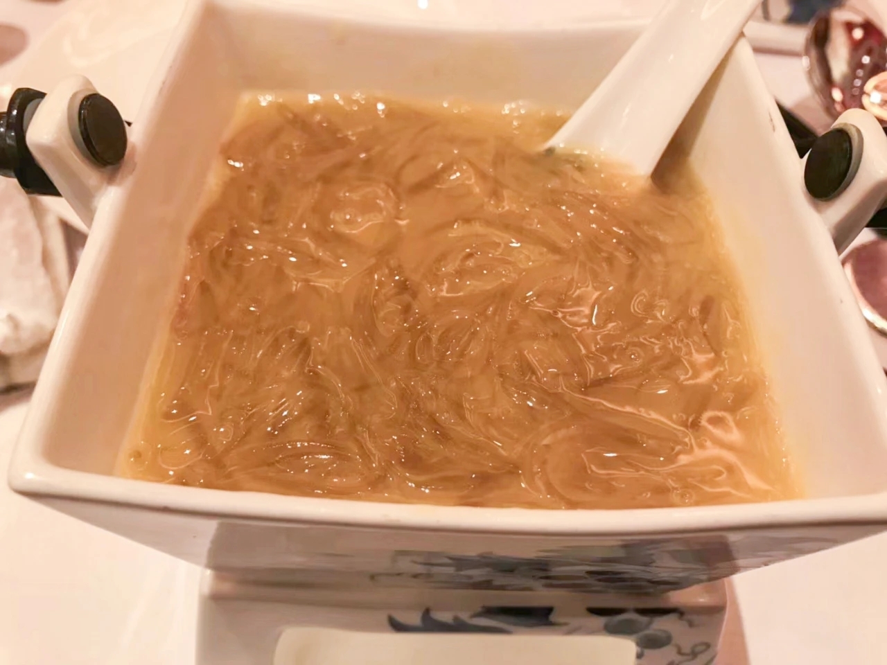到京花轩,当然要尝谭家菜的招牌菜黄焖鱼翅。用三年老母鸡、整鸭、干贝、火腿按比例下锅,用两天工夫,将鸡、鸭完全熬化,溶于汤中,过细箩,出醇汤。这个过程复杂得很,但烹饪逻辑却十分清晰:在烹饪中,汤的主要功能是萃取风味,三年老母鸡,风味十足;母鸡、鸭、火腿贡献谷氨酸,干贝贡献了核苷酸,两者协同作战,鲜味提升了二十倍以上;两天的熬制,风味物质彻底释放,蛋白质也尽可能多地跑到汤里,尽管大部分还在汤渣里;汤里的主要成分,除了贡献味道的风味物质和氨基酸,更多的是水、脂肪和蛋白质,水和脂肪不相溶,但蛋白质亲水端抓住水,疏水端抓住脂肪,三者结合就是黄色的浓汤;经过两天的熬制,鸡、鸭、火腿、干贝的大量肉碎分布在汤中,十分混浊,用箩过滤,肉碎被隔离出来,汤因此既浓又醇……鱼翅选用吕宋黄,这种翅产于菲律宾,翅中有一层象肥膘一样的肉,口感丰美,翅筋层层排在肉里边,胶原蛋白丰富,质量上乘。用温水泡透、发透,决不用火碱急发,以免破坏营养成分。将发好的鱼翅放入汤中,用文火焖上一日,整个鱼翅烹制过程需三日火工。这样焖出来的鱼翅,汁浓、味厚,金黄而透亮,鲜浓而不腻口,入口后的鲜美余韵悠长,吃着柔软濡滑,极为鲜美。上菜时,很是细致地在碗下点上一根小蜡烛,为这道菜加热保温,这份贴心也很科学:充满胶原蛋白的菜,温度低一点会影响口感,低于25℃就会凝固。谭家菜的口感都是软濡滑,我想这大概是清末民国初,能吃上谭家菜的达官贵人,都是上了年纪,牙口不好的缘故。爽、脆这一类的,谭家菜都不屑一顾。
