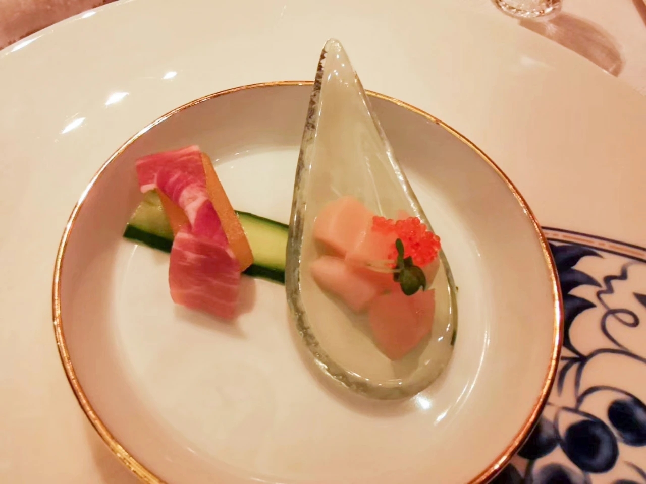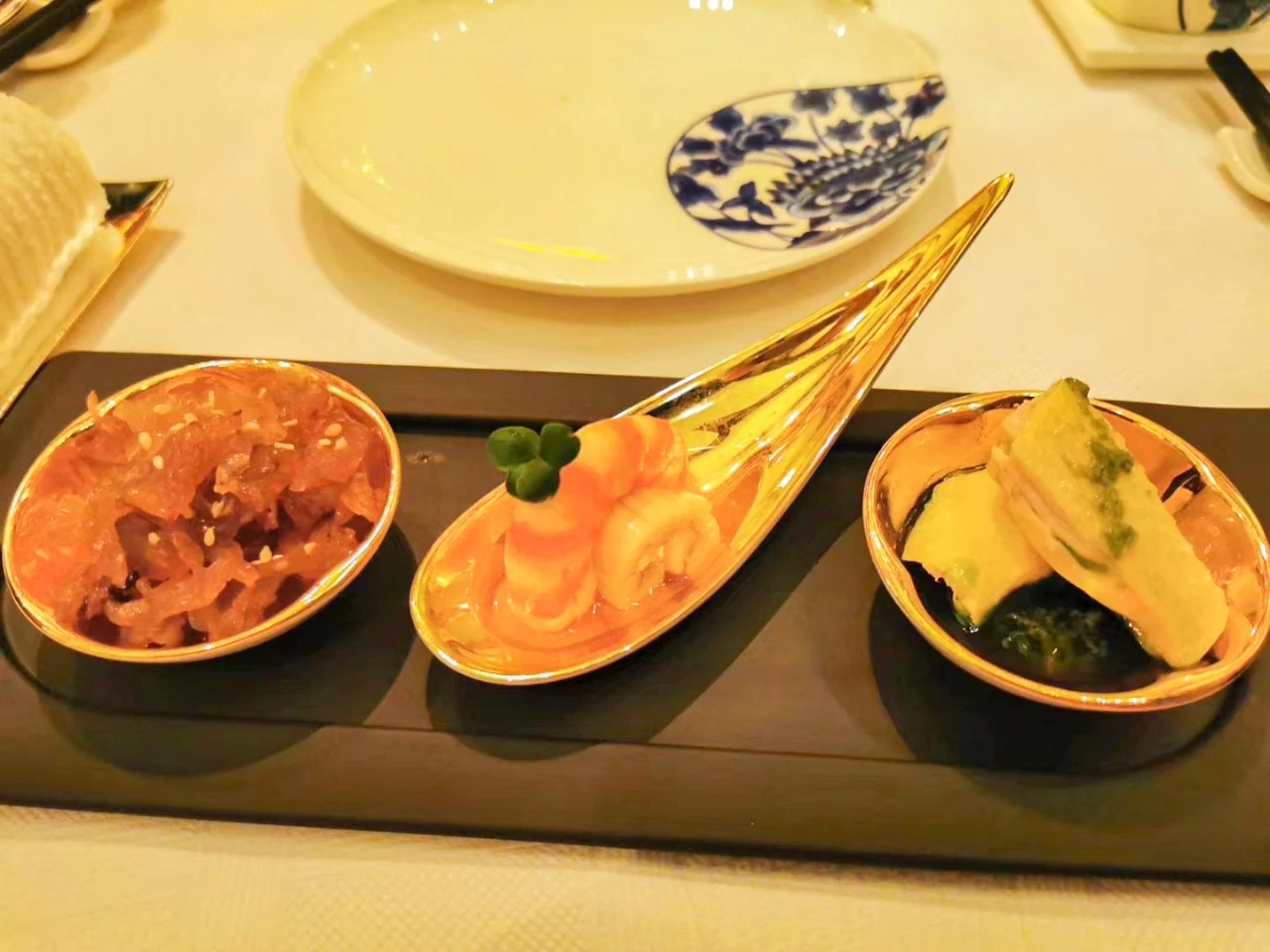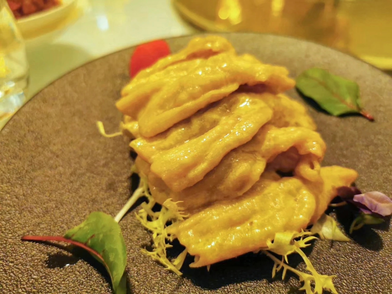 令我印象深刻的还有凉菜芥末鸭掌。这是一道典型的北京菜,鸭掌去骨,用芥末酱和花生酱调和淋上,糯中带脆,辣中带香。这是一道功夫菜,少说有六百年的历史。据大董老师考证,这道菜是全聚德烤鸭的衍生产品,地道的中国菜。没错,芥末也是中国的,黄芥末是芥菜的种子磨成的,地地道道的国货。我们常看到的青芥末,是辣根磨粉加色素的调制品,用来骗中国人吃鱼生用,至于正宗日本刺身用的调味料,那叫山葵。鸭掌,本身并不值钱,但做这道菜太费工夫,因为要给鸭掌去骨。据大董老师说,北京大董也有这道菜,因为太受欢迎,很容易就卖完,熟客点不到这道菜会骂人,说负责点菜的是“宫里的老公骑骟驴”,没用!鸭掌本为普通的食材,经如此精致的处理,马上鸟枪换炮,传统中餐的高端菜,也不是简单的名贵食材堆积,普通食材花上功夫,也同样出彩。