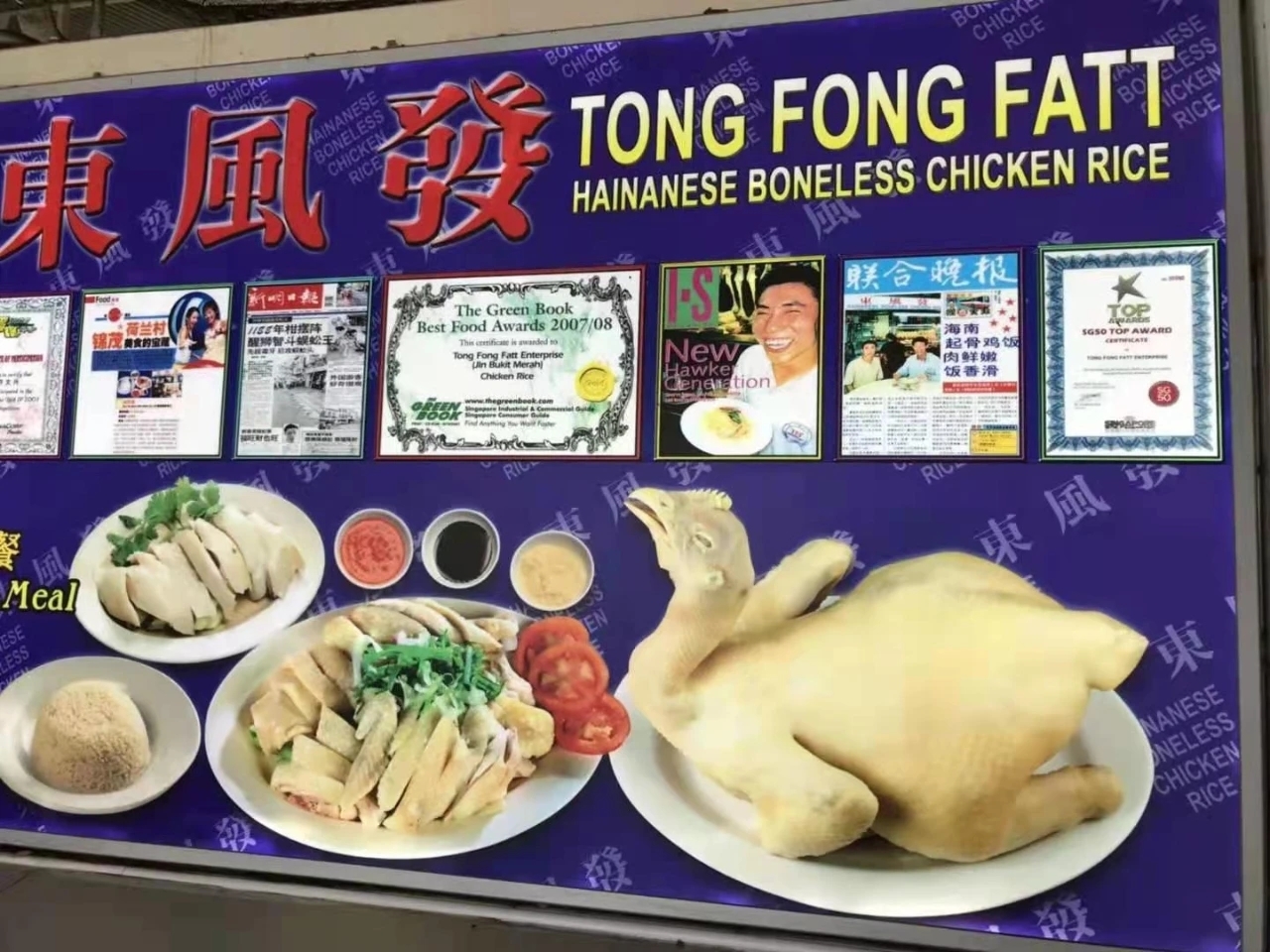 实话实说,对在国内吃到的海南鸡饭,我印象很一般。这种鸡和饭的组合,就是为了快速填饱肚子,分开来看,鸡不过是白切鸡,白切鸡好不好吃,由鸡龄、鸡吃什么、鸡的生活环境和烹饪技法所决定,有哪一家海南鸡饭的白切鸡在这些方面很讲究?饭好不好吃,主要由米好不好决定,又有哪一家海南鸡饭舍得用上等大米来做?到了新加坡,相信找到了“正宗”,应该可以改变我的印象。去哪家好呢?当地朋友推荐了一家“东风发”,据说是李显龙总理的最爱,国宴都在他们家打包。