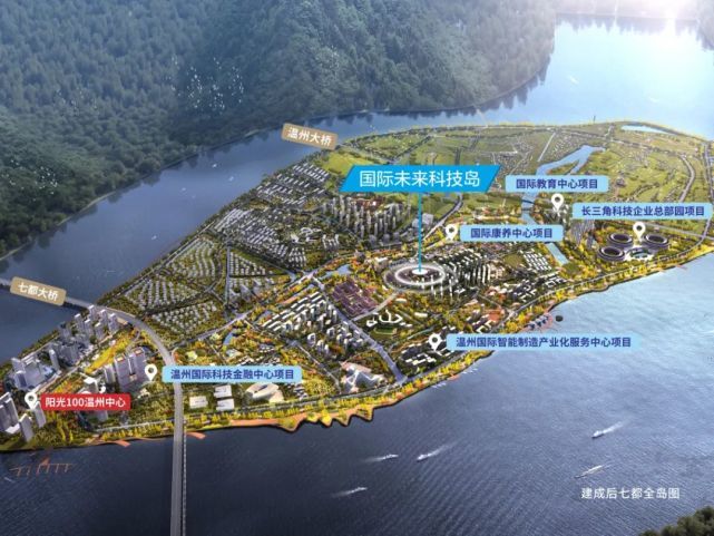 七都岛,总投资约218亿规划国际未来科技岛,聚焦科创、金融、康养、教育四大板块,建造“一园四中心”,打造辐射长三角、在全国具有影响力的科技创新高地和区域性金融中心,千亿级产业集群在岛内正在成形,擎领温州磅礴之心。