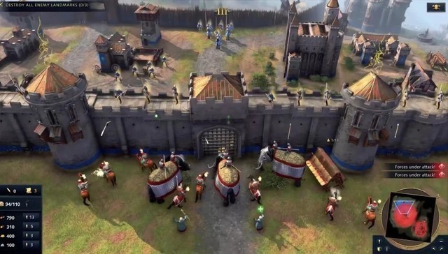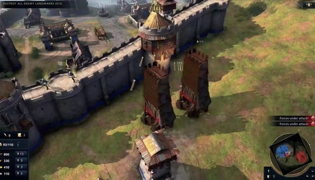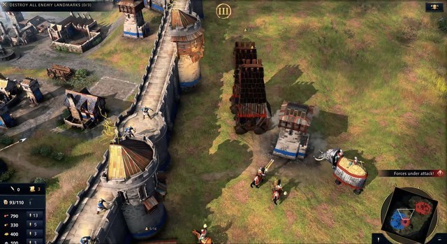 操作和玩法设计,主要的亮点还是增加的更多的兵种,《帝国时代4》新增了攻城机械的兵种单位,在实际玩的过程中发现特点十分鲜明,攻城机械移动缓慢、射程远、速度慢,对建筑有很高的伤害,对大面积扎堆的敌军单位也有强杀伤力,但是应对步兵和骑兵近身攻击基本上就和纸糊的一样,随便几个步兵单位就可以拆掉好几个攻城机械。另外还有一些专门针对城墙攻防的单位,比如只能攻击墙体的冲车,把步兵单位直接送上城墙的云梯等。