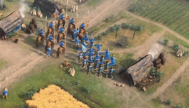 先说画面表现,其实综合来看《帝国时代4》的画面表现相比较之前的作品好了不少,但有些细节的建模还是有点不够准确,比如一些不同兵种之间的差异似乎只有一点点武器装备的细节变化,导致在大场景下无法准确分辨,在游戏过程当中也比较难以选中和区分,下面第一张图的弓箭手小队当中混进去了拿着武器的农民小队,看起来似乎也不违和。