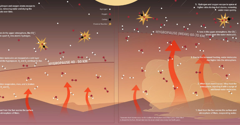简介:火星大气逃逸被证明是由于磁场缺失和太阳带电子撞击导致的。太阳风发出离子和电子,加速火星大气层粒子,在长久轰击下大气层逃逸。