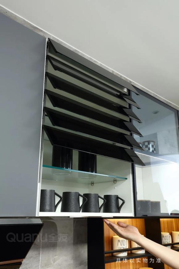 在厨房设置智能升降柜和未来窗,只需轻轻触碰,就可控制吊柜的升降和开启,可以充分利用吊柜空间,老人、小孩都可以轻松使用。