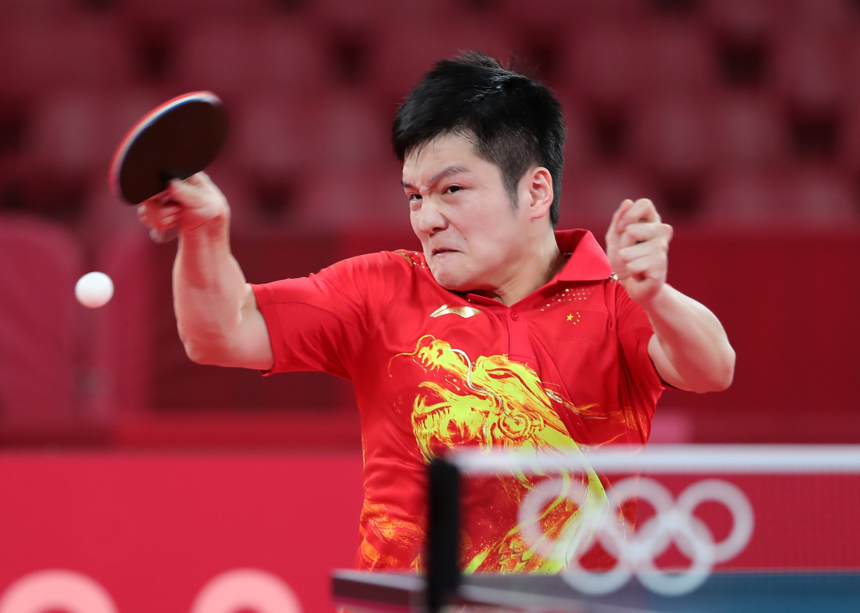 东京奥运会乒乓球男子团体半决赛,许昕/马龙(右)在比赛中。新华社记者 刘大伟 摄