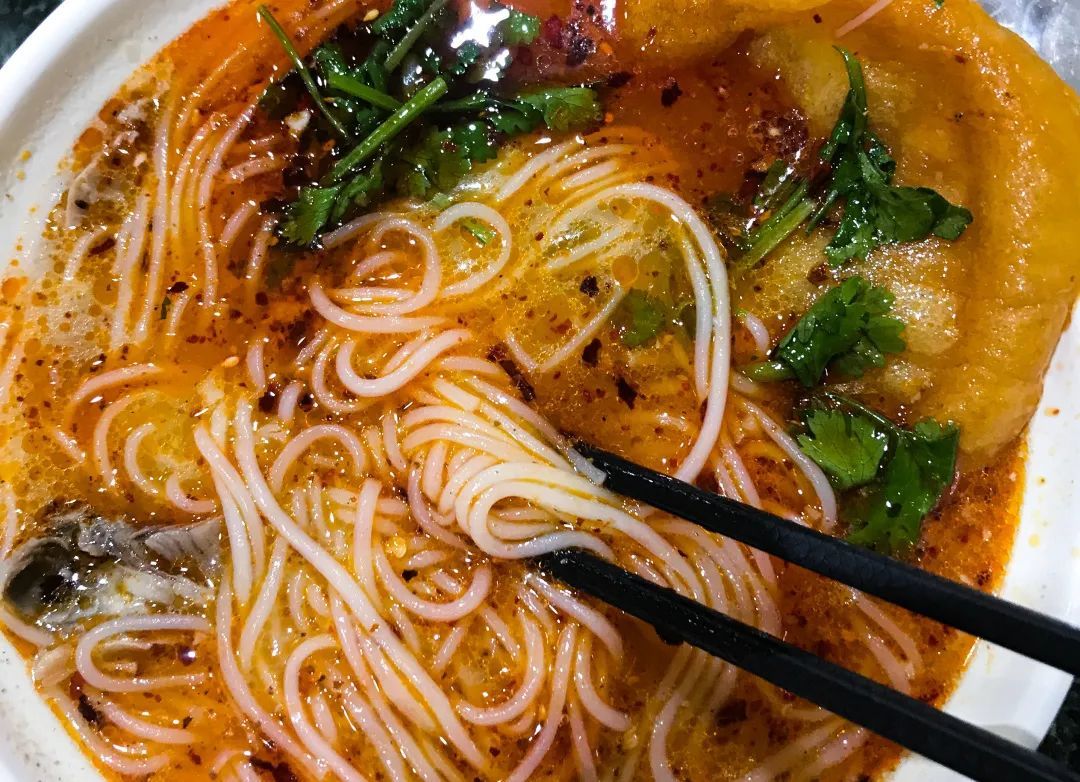 两口大锅,骨汤和羊杂汤雪白莹润,翻滚的汤头若风中哈达,迅速汆烫熟的米粉盛入大碗,滚入两大勺鲜汤,抓一把新鲜香菜碎,一筷子软烂的牛羊肉,最后淋一勺艳丽的红油,雪白、翠绿和橙红,柔滑软绵的米粉,细嫩不膻的浇头,带有浓郁白胡椒香气的靓汤,再追加一块炸得香脆的糍粑块泡进去,强强联合,才是令人食指大动的味觉密码。