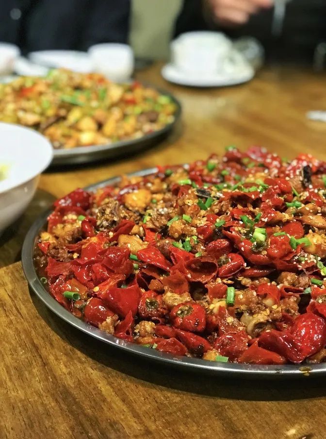 视觉上的超大分量是这两道菜的共同点,新鲜宰杀的兔丁隐没在堆成小山的泡椒粒之间,煎得酥香的鸡肉与深红的圆头椒你侬我侬。从上菜那一刻起,便预示着这顿饭进入了正题,泡椒独有发酵的香气和被油脂激发的辣意像是缠绵的内劲,一浪接一浪的涌过舌根,酥麻之余又是馥郁的脂香,兔丁不大,还有细碎的小骨,但这种唇齿开工的忙碌感何尝不是进食的快乐。