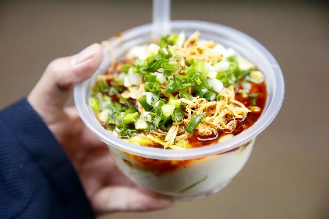 打开不锈钢桶,升腾的热气之后显露出里边儿莹润洁白的豆腐脑,大姐熟练地抄起小纸碗,把颤颤巍巍晃动的豆腐脑给舀下两勺,揭开小板凳旁的调料盒子,超过六种调料,蒜水、辣红油、小香葱和醋,像是白面绢布上盛开了鲜花,肆意的色彩带去了直冲天灵盖的香气。 在四川吃豆腐脑,没有甜咸征战的纠结,统统都是辣的,被红油浸润的豆腐脑只剩下豆类的清香,咸鲜辣酸轮番上阵,在舌头顶破一块豆腐脑的瞬间炸开,到最后,“喝”才是解决这碗豆腐脑的最优解。