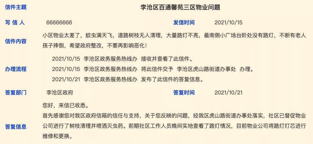 2021年10月21日,李沧区政府对此做出了答复:经我区虎山路街道办事处落实,社区已督促物业公司进行了树枝清理并喷洒灭虫药。前期社区工作人员晚间实地查看了路灯情况,目前物业公司将路灯灯芯进行维修和更换。