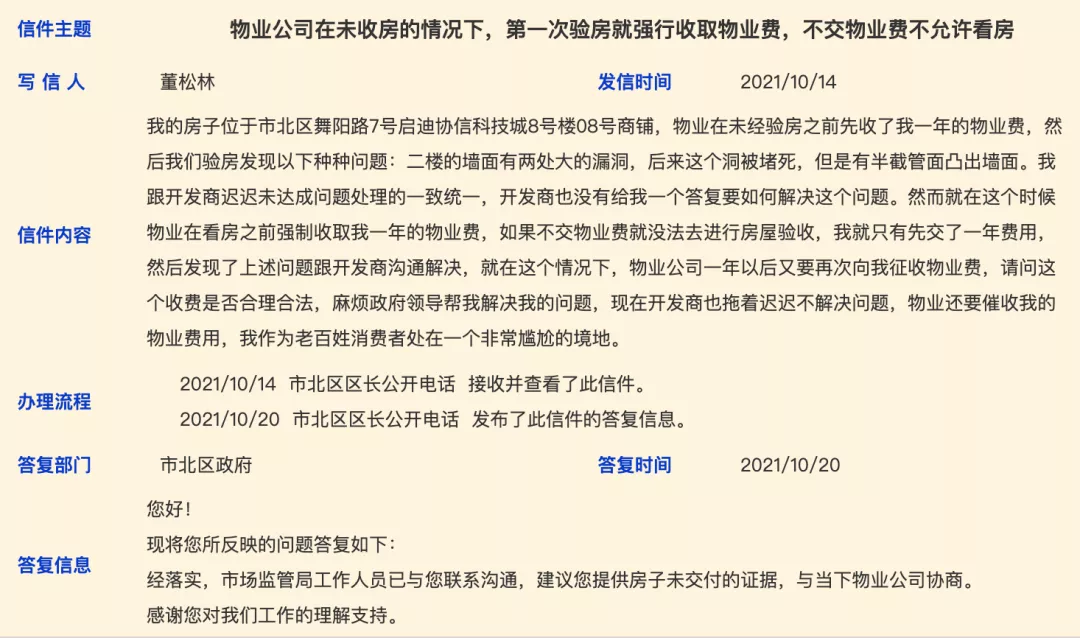 2021年10月20日,市北区政府对此做出了答复:经落实,市场监管局工作人员已与您联系沟通,建议您提供房子未交付的证据,与当下物业公司协商。