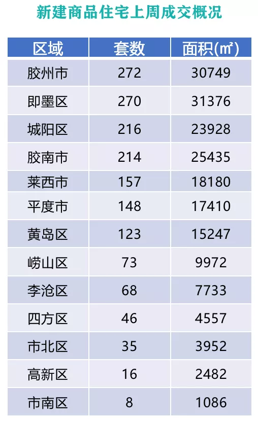其它区域方面,胶南市上周新房成交共计214套,新房总成交面积25435㎡,位列区域成交榜第四;远郊区莱西市上周新房成交共计157套,总成交面积18180㎡;同为远郊区的平度市位列区域成交榜第六名,上周新房成交共计148套,新房总成交面积17410㎡;黄岛区上周成交新房123套共计15247㎡;高新区上周新房成交共计16套,新房总成交面积2482㎡。