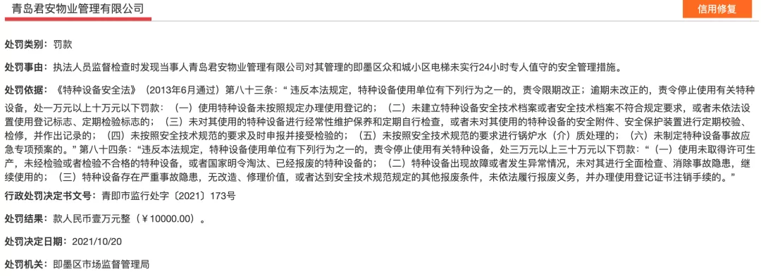 2021年10月20日,据信用中国公示,执法人员监督检查时发现当事人青岛君安物业管理有限公司对其管理的即墨区众和城小区电梯未实行24小时专人值守的安全管理措施。