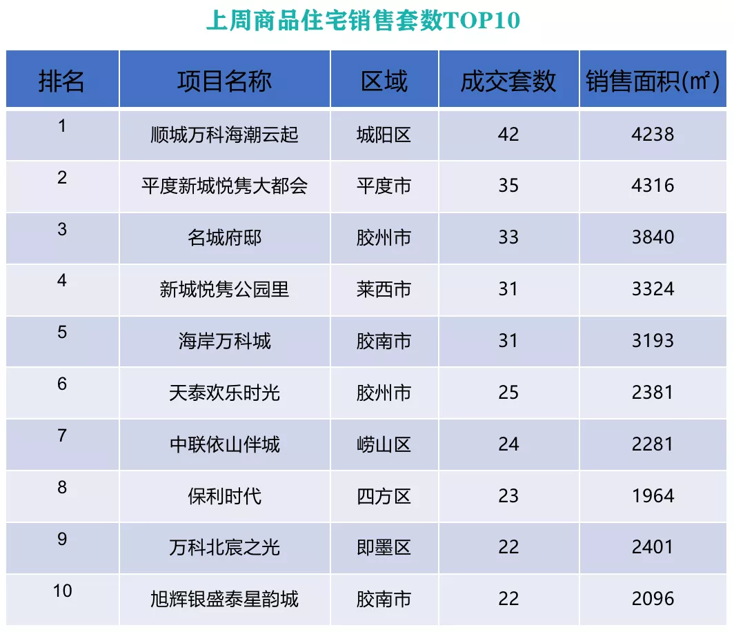 从区域来看,上周区域销量排名小幅变动,胶州连续三周持续领跑全市。