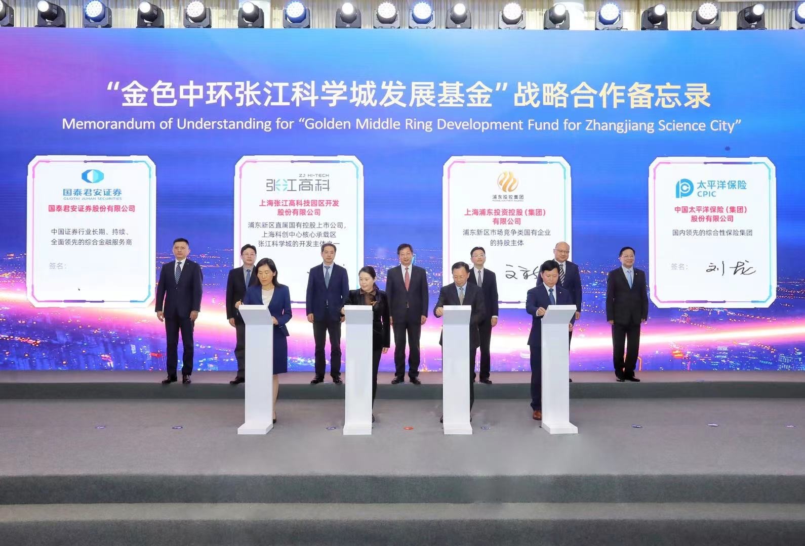 為進一步推動金色中環發展帶建設,促進張江科學城更新升級,上海浦東投資控股(集團)有限公司與上海張江高科技園區開發股份有限公司發起設立「金色中環張江科學城發展基金」,投資規模約50億元。基金所投資的項目集中在科學城範圍內,以重點項目新建、自持物業更新、核心資源收儲為主。現場,上海浦東投資控股(集團)有限公司、上海張江高科技園區開發股份有限公司、中國太平洋保險(集團)股份有限公司、國泰君安證券股份有限公司等,共同簽署 「金色中環張江科學城發展基金」戰略合作備忘錄。