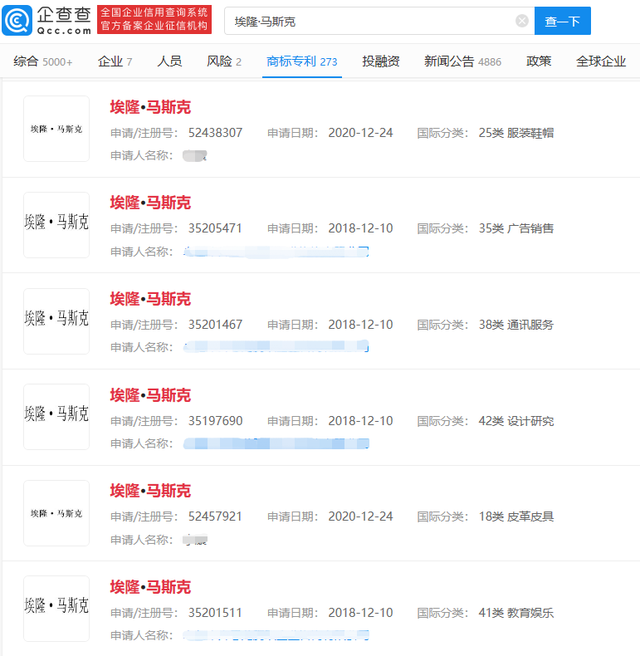 企查查 App 显示,马斯克原名“埃隆・马斯克”已被多方注册成商标,国际分类涉服装鞋帽、皮革皮具等。