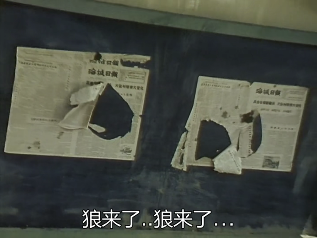 在这段镜头语言中,狼来了的故事作为背景音,画面却是海城日报的印刷过程,和公示栏上残破的报纸。这仿佛正在隐喻,时下的新闻早已和事实渐行渐远。