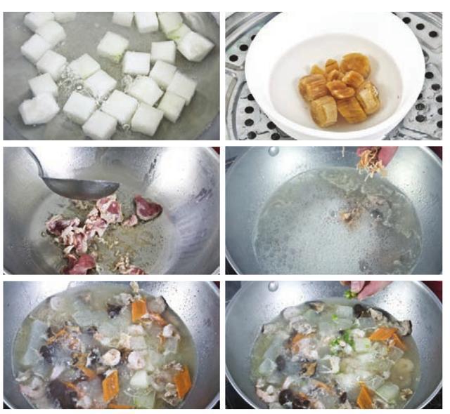 原料冬瓜250克,干贝、虾仁、猪肉各50克,香菇30克,胡萝卜20克。