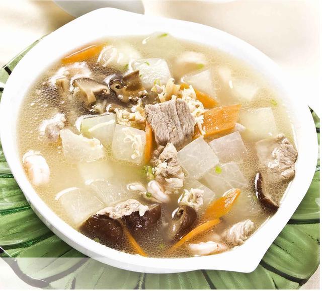 3 放入冬瓜块、香菇和胡萝卜片,转小火续煮3分钟。