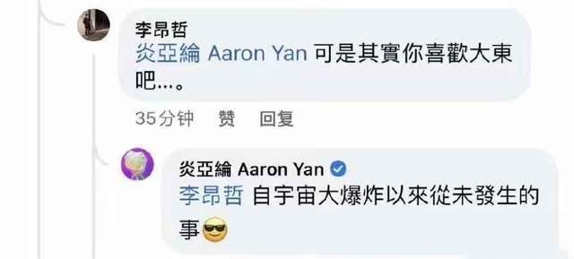 近日,又有网友将炎亚纶与汪东城的陈年旧事翻出来,直接在炎亚纶的社交账号下留言称:“可是其实你喜欢大东吧。”对此,炎亚纶直接回怼:“自宇宙大爆炸以来从未发生的事”,否认与汪东城的绯闻。