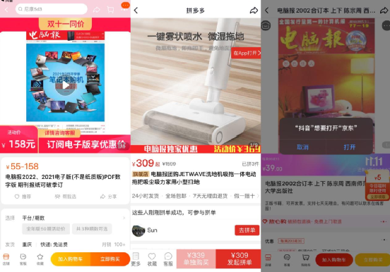 据悉,现在在抖音群聊内,用户也可以直接打开淘宝、京东、拼多多这些电商的商品分享链接,点击商品链接即可直接跳转到所对应的电商 App 并进行下单,这套操作恰好赶上了这一次的双 11 浪潮。