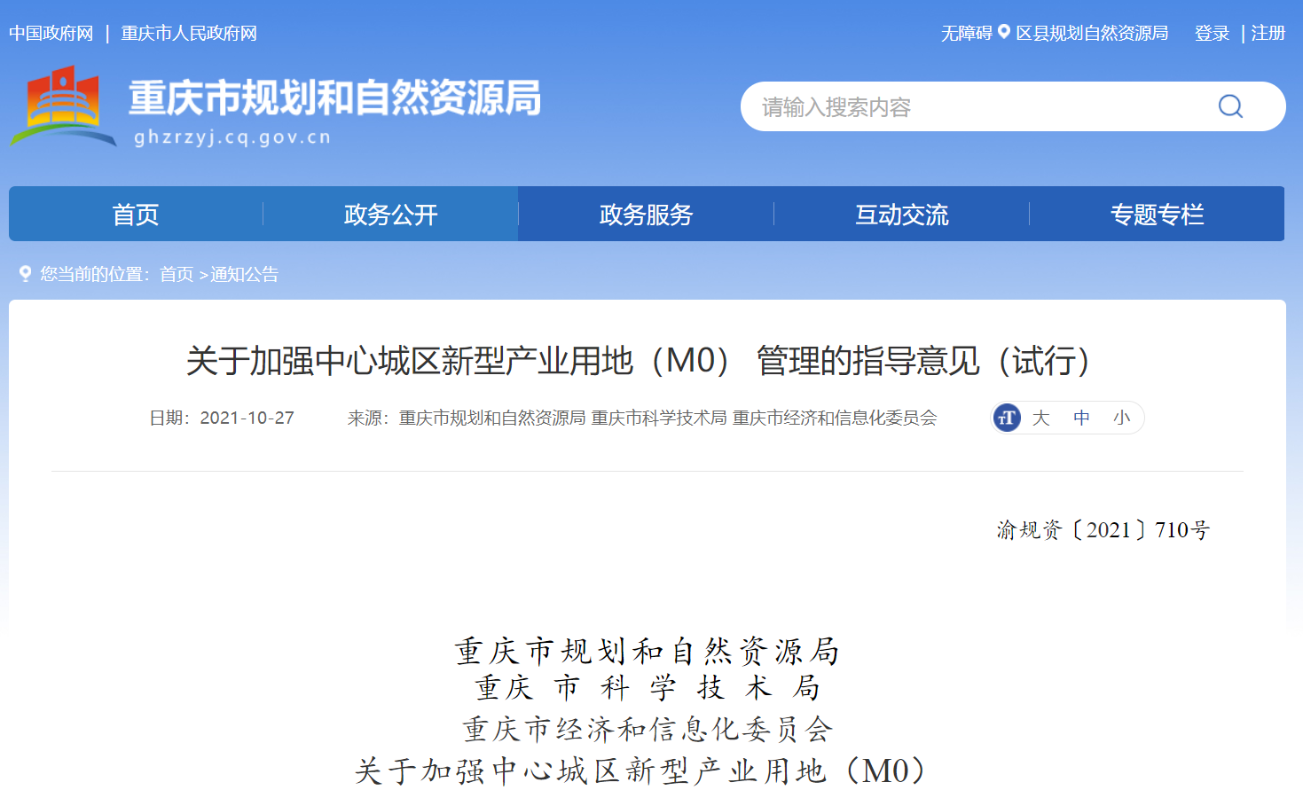 乐居买房讯 言鑫赫 10月27日,重庆市规划和自然资源局、重庆市科学技术局、重庆市经济和信息化委员会联合发布《关于加强中心城区新型产业用地(M0) 管理的指导意见(试行)》(以下简称《意见》)文件。