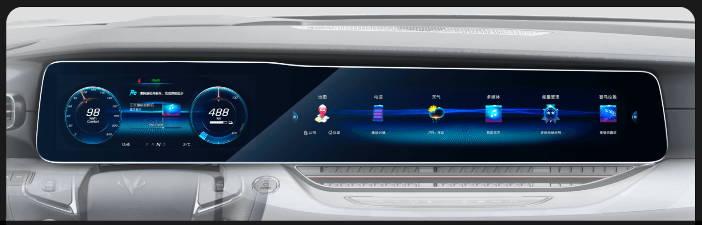 ARCFOX 极狐阿尔法 S 华为 HI 版搭载鸿蒙 OS 智能互联座舱,具有 21.69 英寸一体式超清大屏,支持 3840*720 分辨率、180PPI 显示精度。车内座舱搭载麒麟 990A 芯片,具有 3.5TOPs 算力,支持 5G 网络连接。