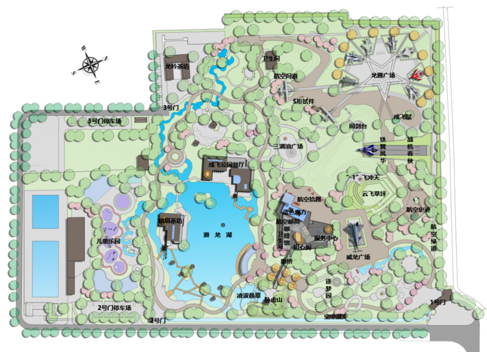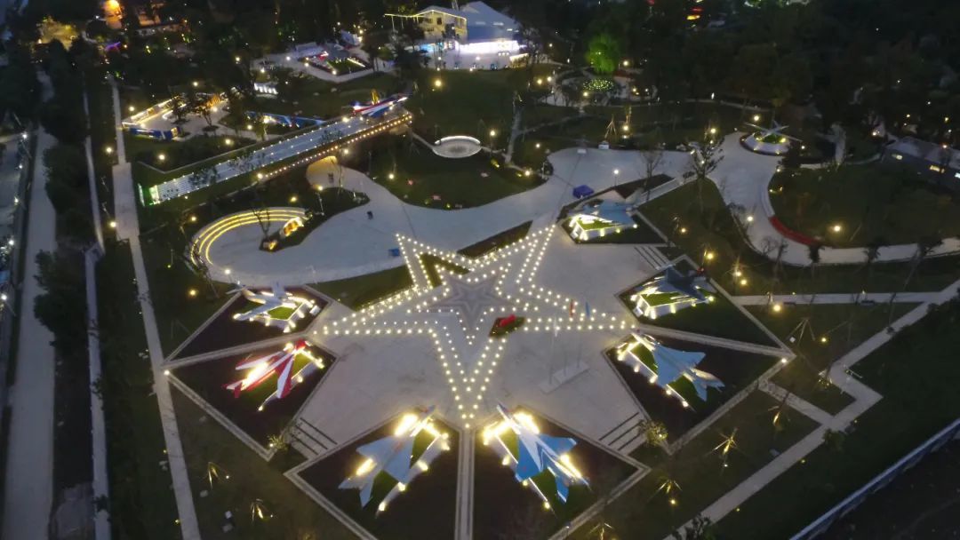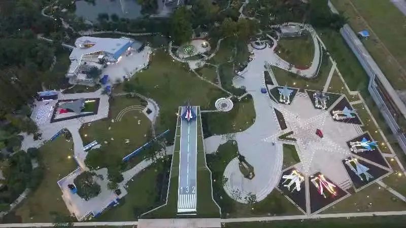 园区巧妙运用地形空间,通过草、木、坡、台等园林景观,以翠松衬国防利剑,12架战鹰在绿草如茵、绿树成荫的自然风光中振翅欲飞,可谓是一步一风景,一景一陶然。