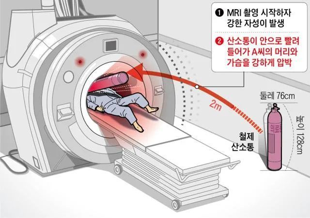 韩国金海市综合医院一名患者在核磁共振时,被突然飞入检查仪器的金属氧气瓶夹住而死亡。警方调查称:是核磁共振设备的磁场把氧气瓶吸进去导致