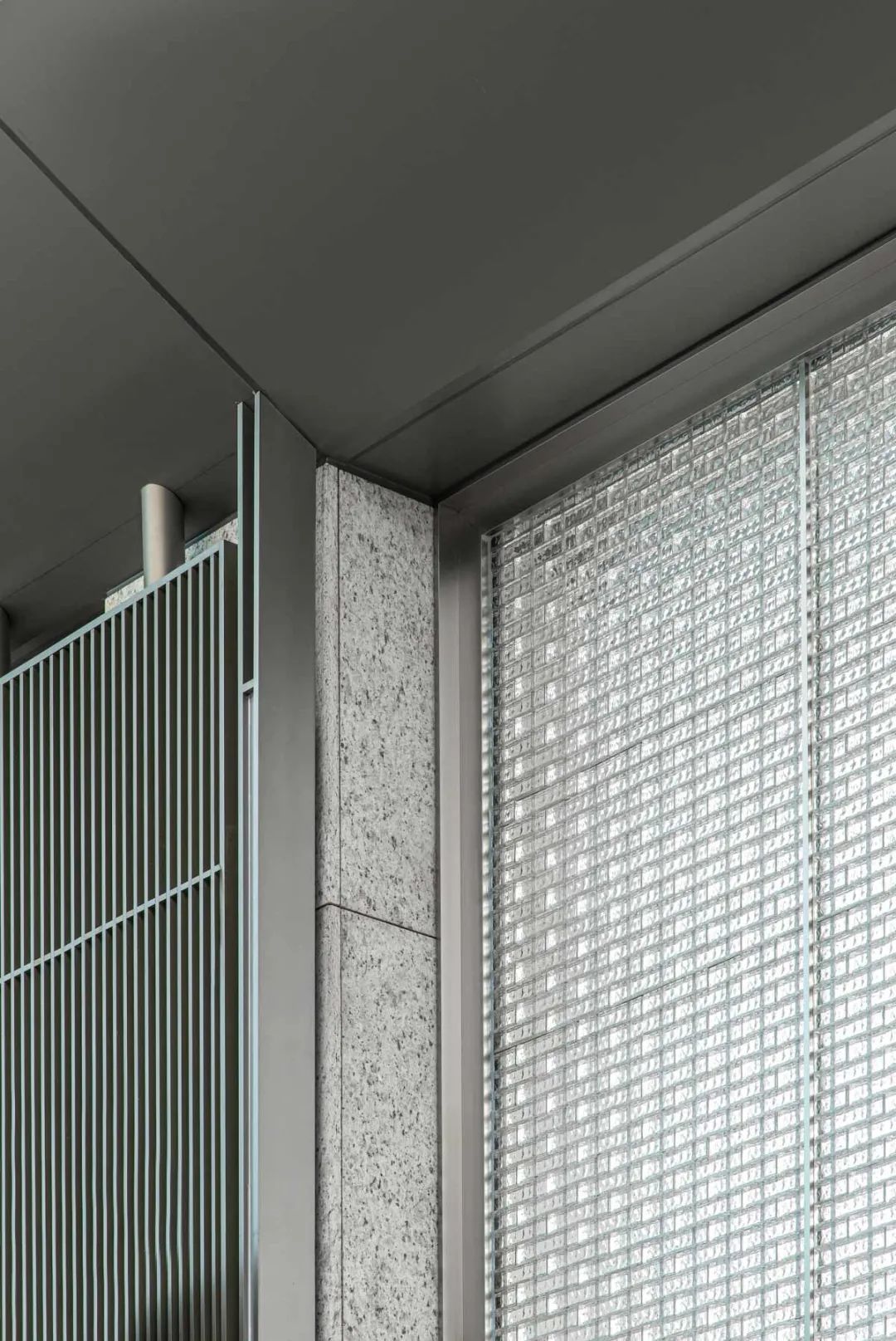 玻璃砖墙外侧为铝合金型材压边,中间通过竖向金属立挺将整面划分为2:1,比例更加优美精致。玻璃砖采用240x50x50mm模数,为保证其稳定性,每块玻璃砖内置两根加强钢筋,安装时从下部穿过,悬挂式安装。