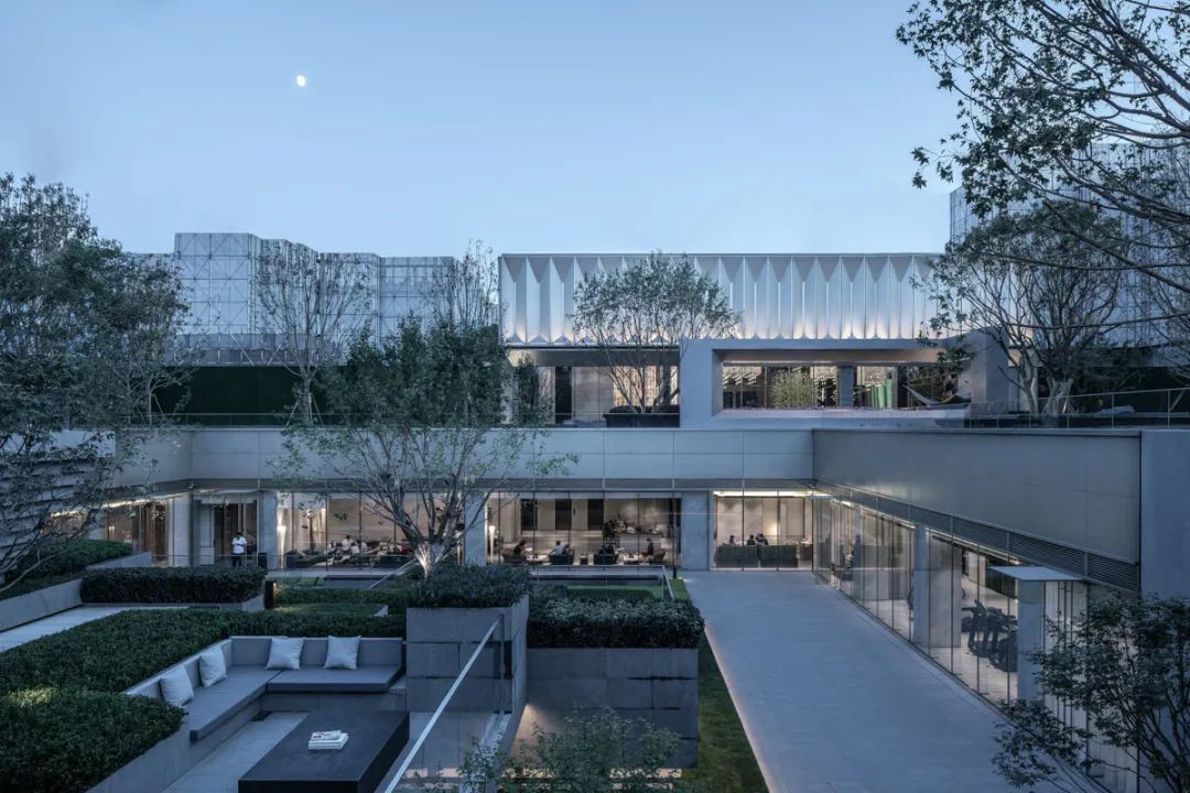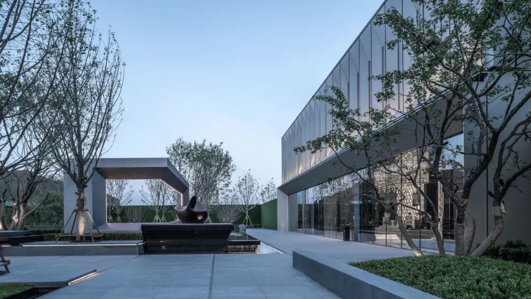 本案采用经典的轴线布局,大门,社区中心及下沉会所,形成层层递进式的两进院空间布局。大门与社区中心通过廊架围合,传统的空间秩序为观者创造仪式感与归属感。斜面元素一以贯之,以多种形式在不同空间中呈现与重构,成为本案独特的精神符号。