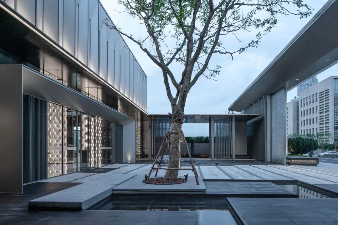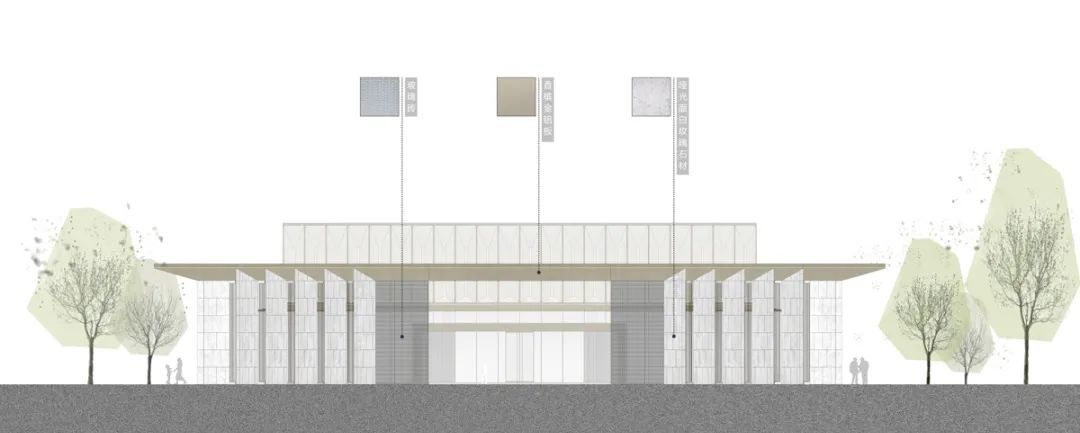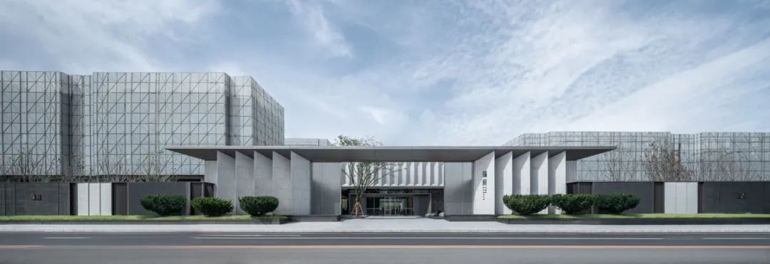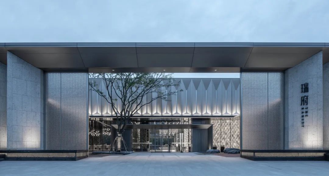 大门,是整个轴线的起始。斜面石材造型支撑起金属挑檐,延展界面的同时给予一定的导向性,赋予大门气势与韵律。层叠的玻璃砖,掩映于开敞入口的两侧,半虚半实,以光影模糊城市的喧嚣。