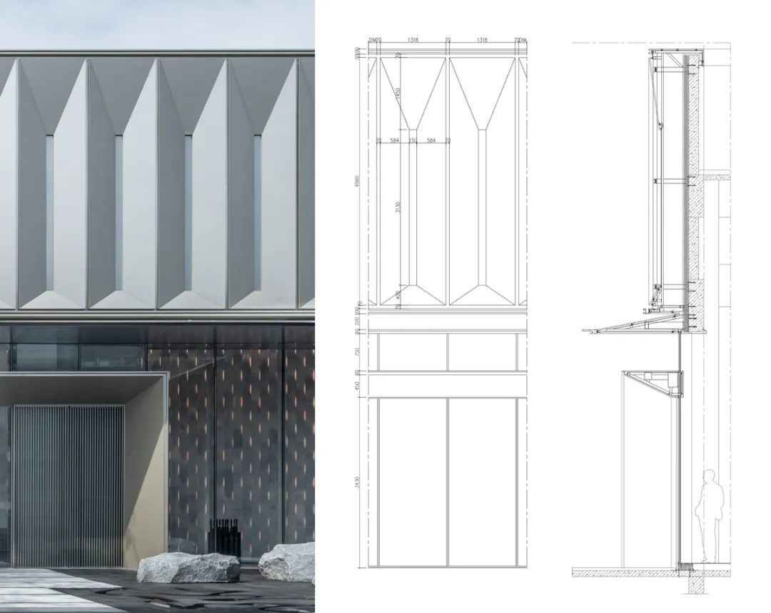 铝板造型框为密拼做法无胶缝,每个造型框独立安装,内侧土建做防水层,保证外立面的简约纯粹。四块整面蜂窝铝板拼接而成的造型框,比例约为1:4,修长有力。造型框内嵌亚克力板,每两个造型框之间保留70x70mm凹槽,丰富立面细节,增加其韵律感。