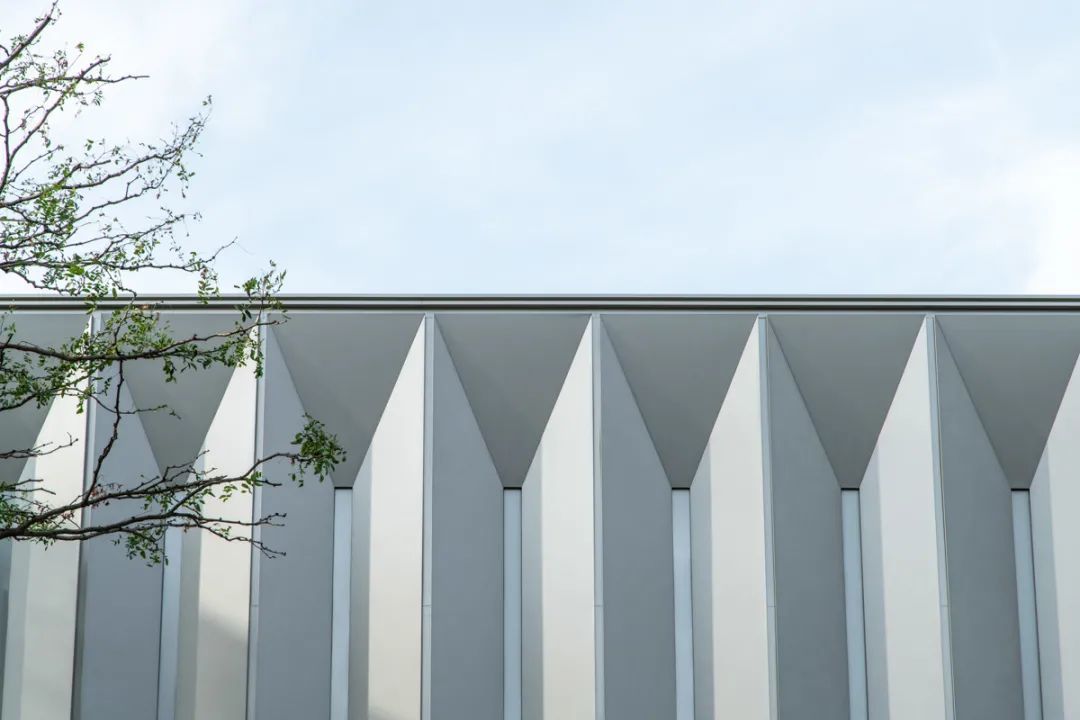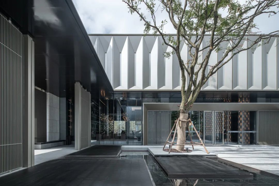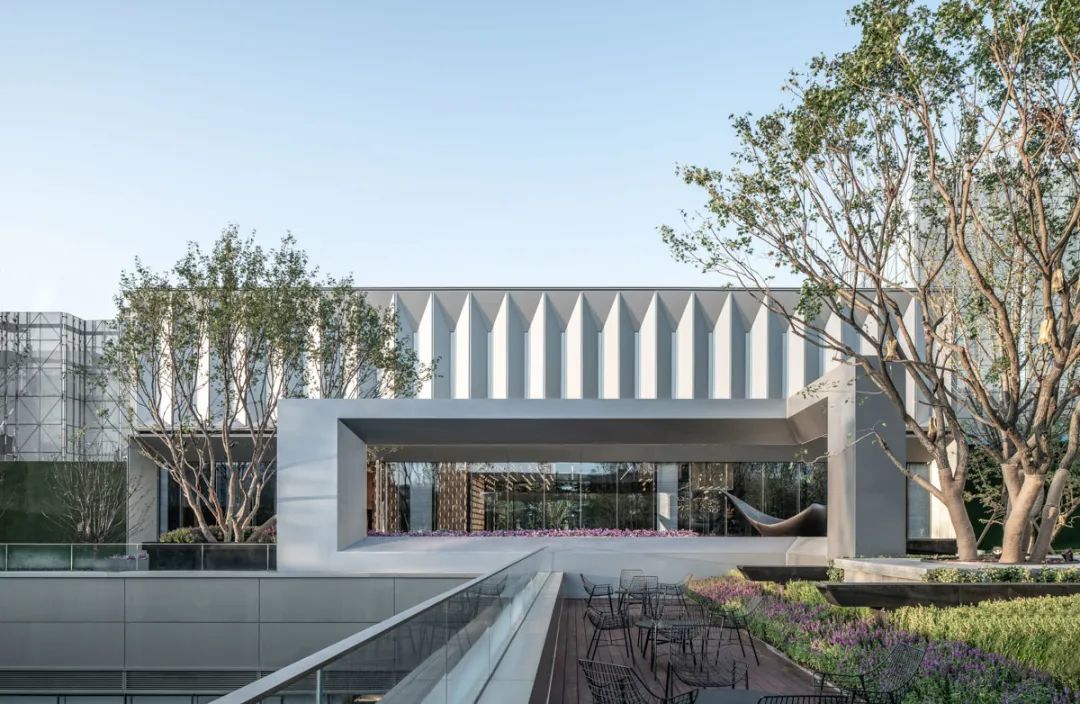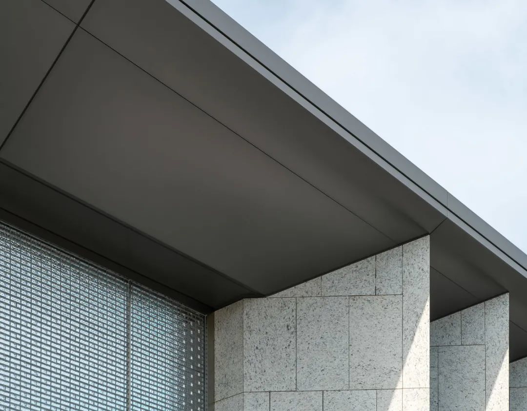 廊架与建筑主体一体设计,顺势而下的斜屋面雅致工整,结合超薄型材檐口做法,实践了东方建筑元素在现代语境中的再演绎。
