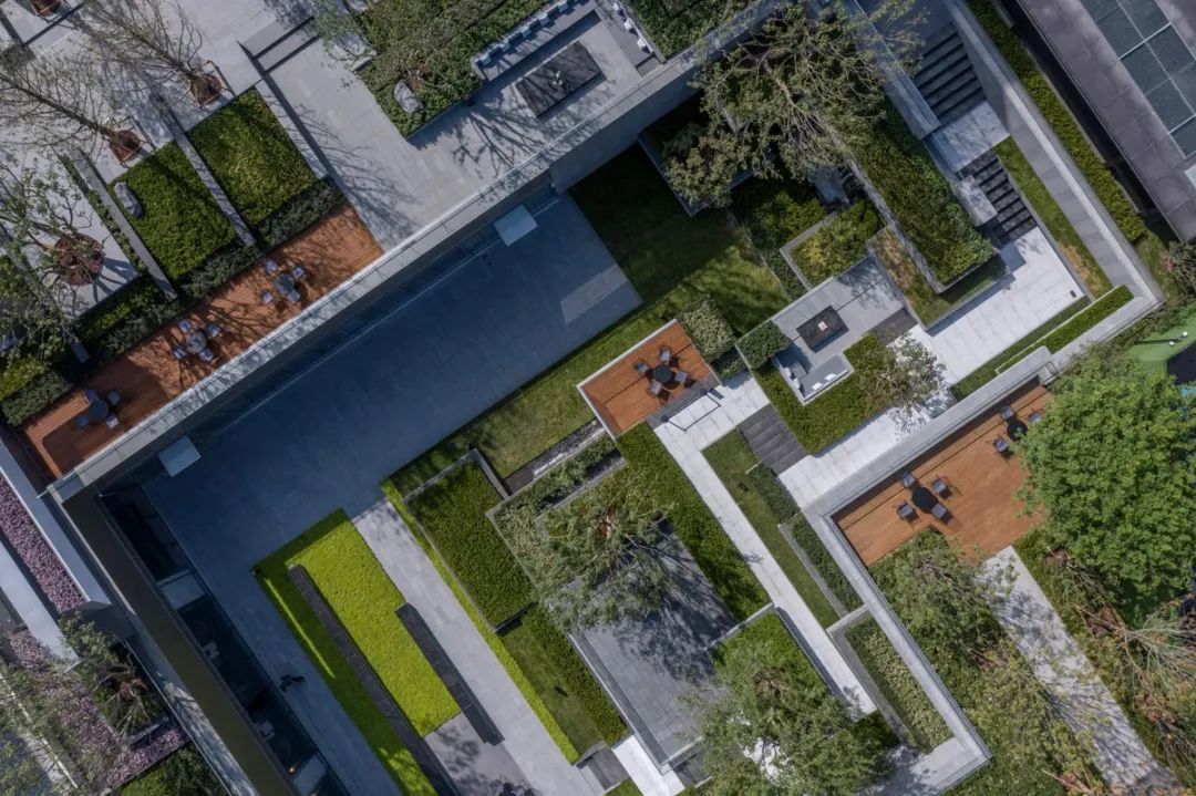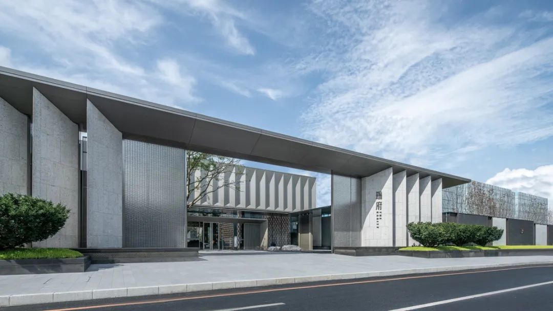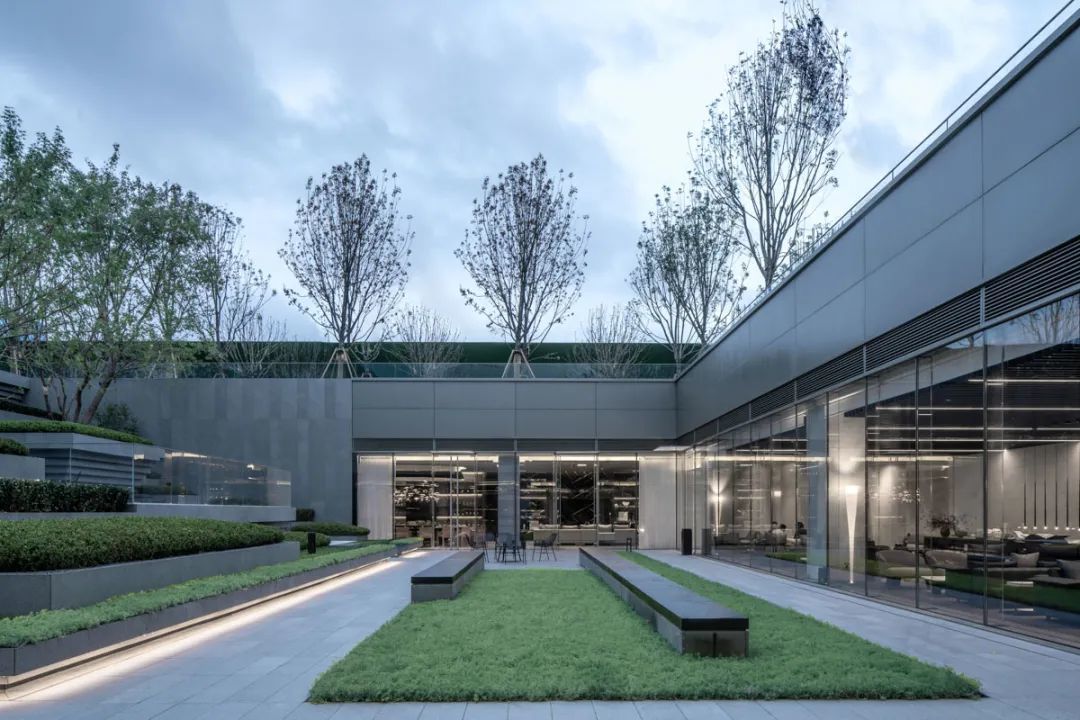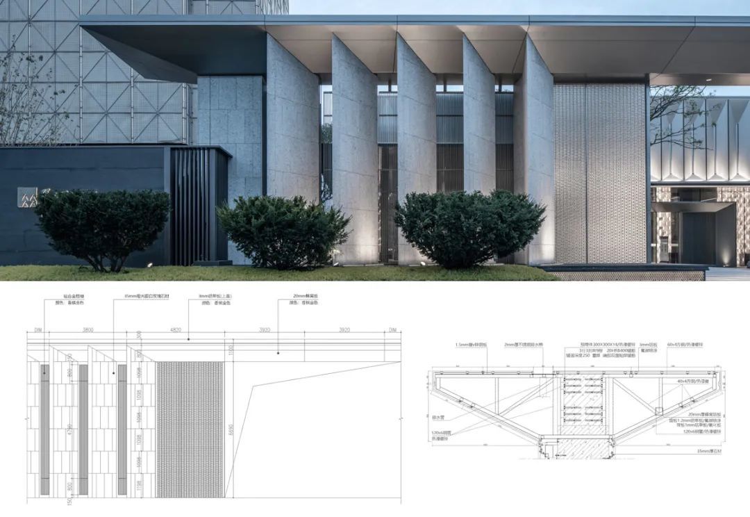 廊架与建筑主体一体设计,顺势而下的斜屋面雅致工整,结合超薄型材檐口做法,实践了东方建筑元素在现代语境中的再演绎。