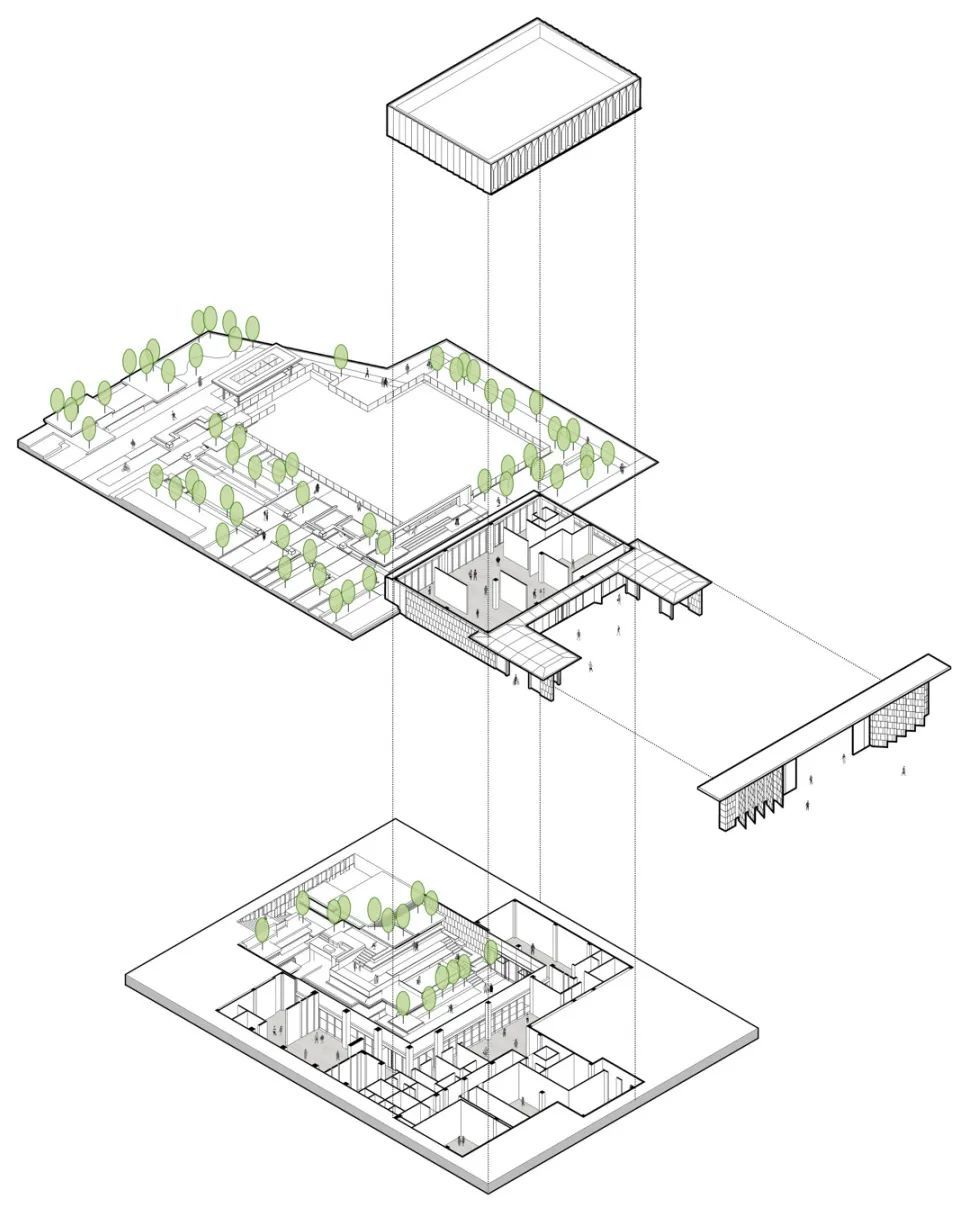 下沉庭院将山景地势延伸至建筑空间中,建筑与自然,人与景,观者与被观者,共存于亦动亦静的空间中。