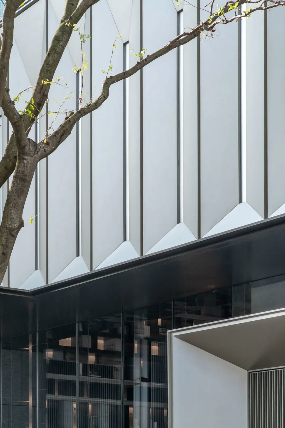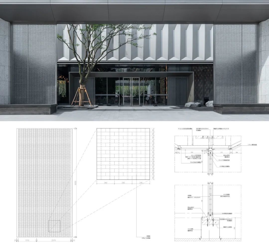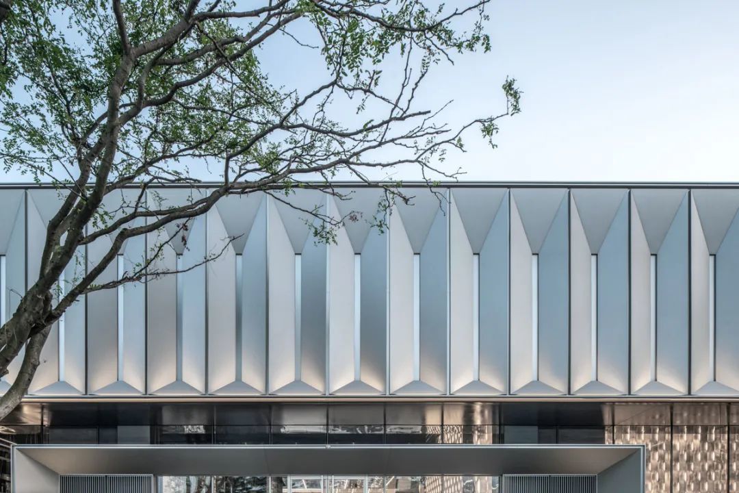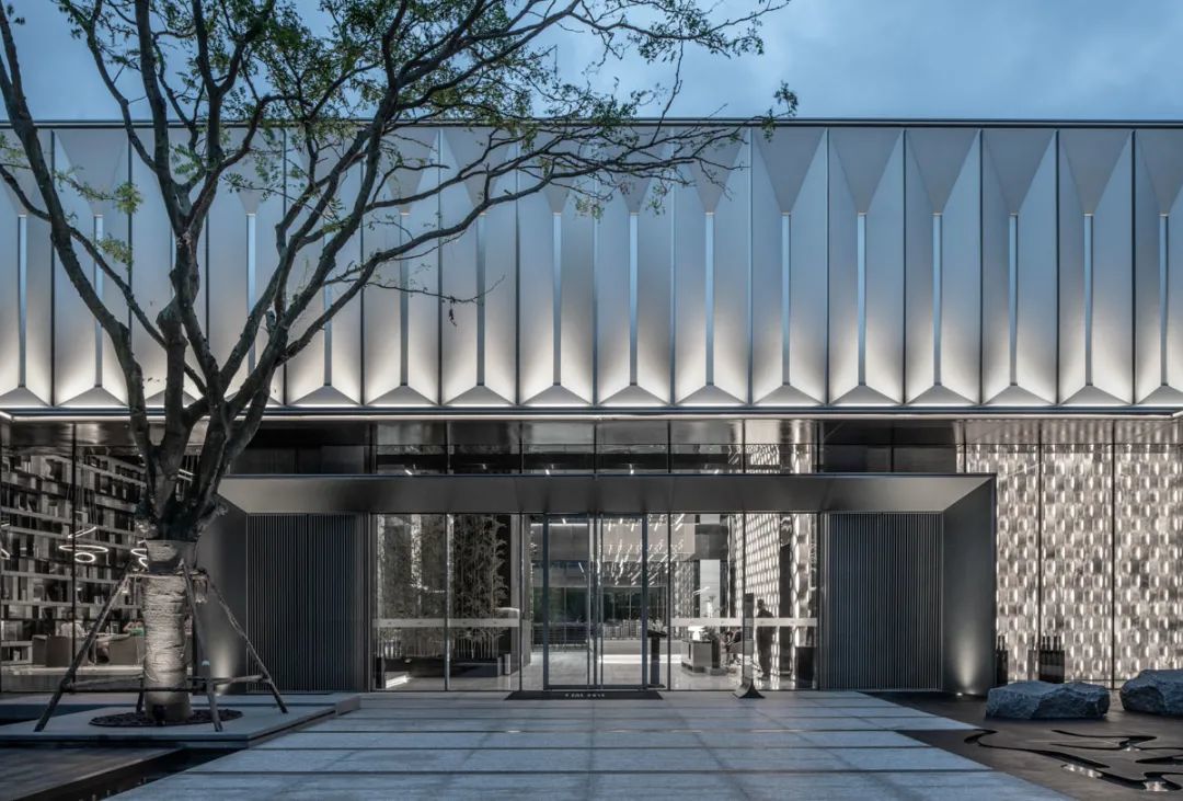 斜面框自传统佛龛造型演化而来,取其形制,去其繁杂,斜向大面铝板密拼,内嵌磨砂亚克力板,引申现代东方韵味。极致简约的斜面拼接模块沿整面浅香槟铝板重复排列,呈现随光影变化的韵律效果。5m高的无缝铝板,上部型材压边,对体量形成了自然的竖向划分,工整雅致又不失细节品质。