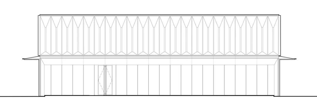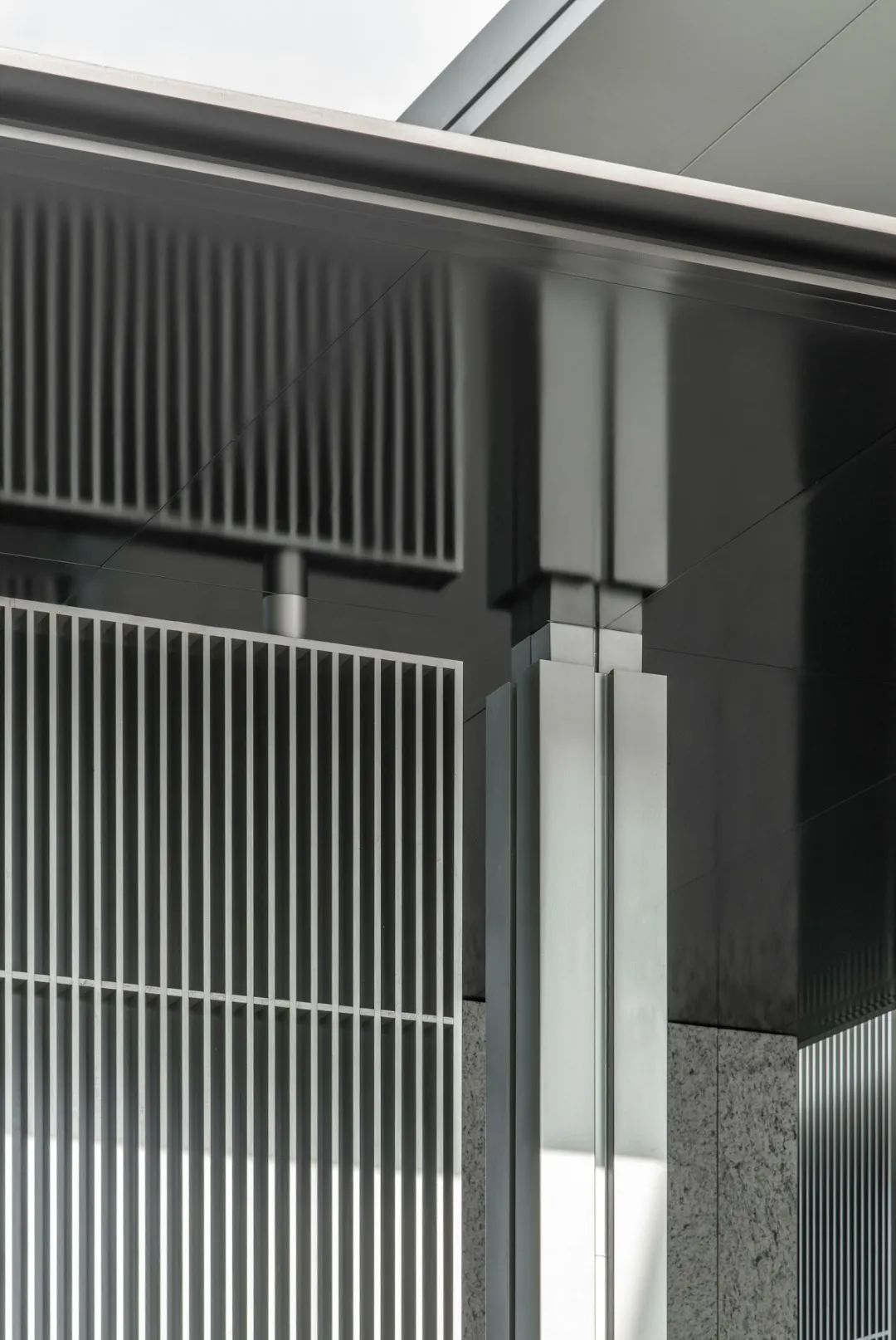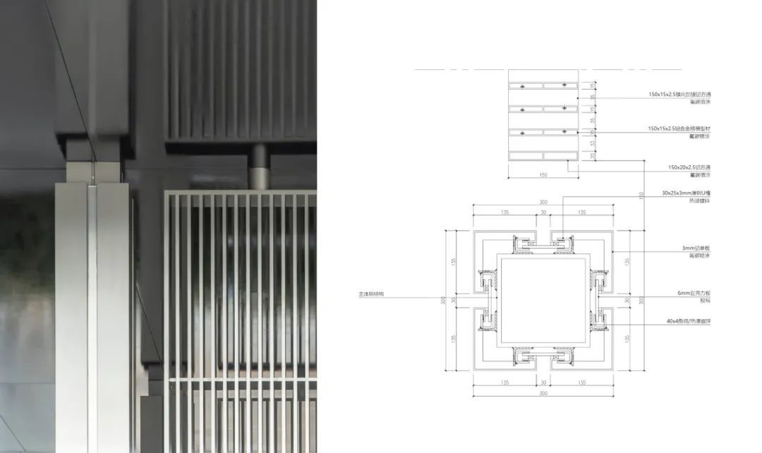 社区中心两侧连廊挑檐为型材,保证端部位置线脚的挺拔。立柱顶部作收分,主体平面一分为四,中间预置凹槽,内嵌亚克力板,通过比例划分使立柱更显纤细。金属立柱既起到结构支撑作用,亦是连廊空间的重要划分。立柱中间设置金属格栅,每根格栅尽量纤薄,尺寸仅为15x150mm,格栅上下增设横向加强铝方通,在保证结构稳定的同时,也为通长格栅作一定的比例切割。