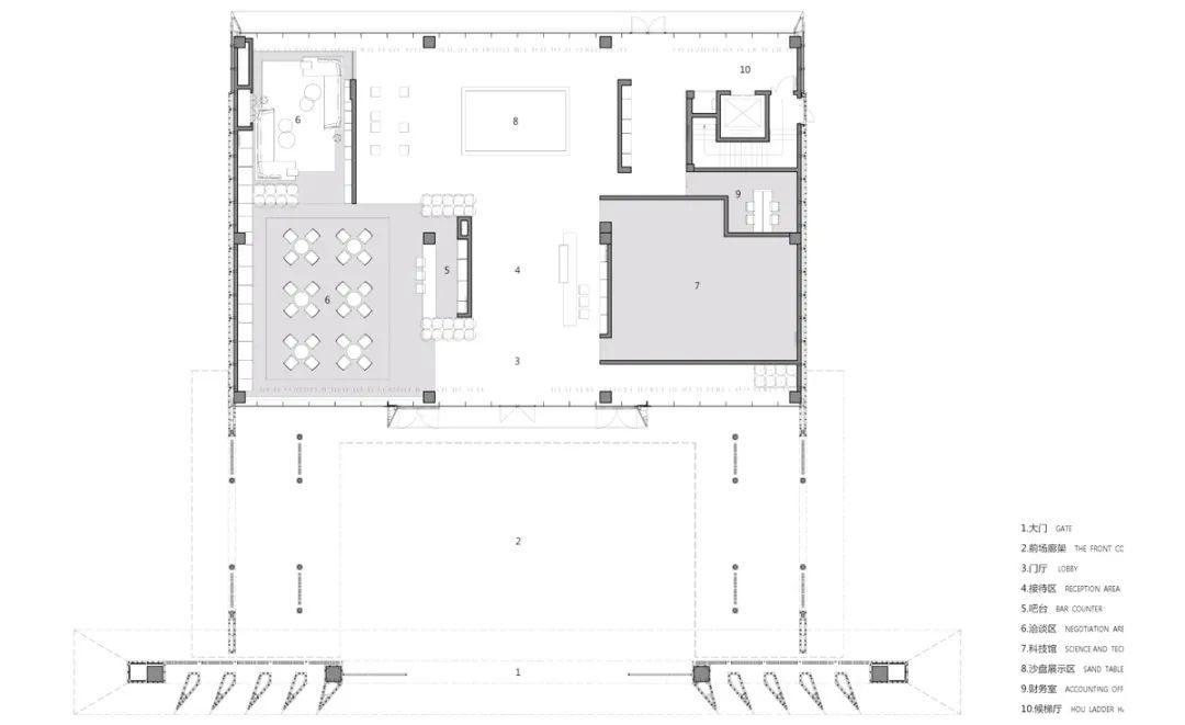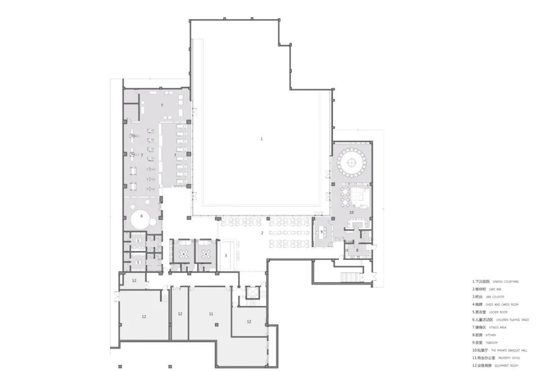 通过北侧电梯到达地下,平面分为三部分,正对电梯的开敞型咖啡吧、东侧私宴聚会区和西侧文娱区。在咖啡吧,观者视线直通下沉庭院,如白居易诗中所言“偶得幽闲境,遂忘尘俗心。”私宴区为私密空间,另设可出入于下沉庭院的门,以突破室内外空间限定,人与自然和谐互动,聚会氛围更加惬意自由。西侧娱乐区面向下沉庭院,在私人专享的休闲空间中增加了自然化的场景,以景观之“静”衬托空间之“动”,建筑与自然融汇交互。