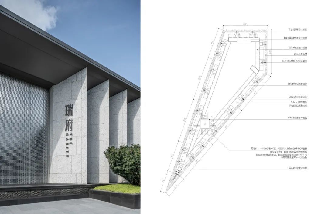 大门竖向造型斜向布置,哑光面白玫瑰石材沉稳厚重,端部采用整石工艺,与石材主体密拼,大面厚重,端部轻巧。斜面石材呈现向上趋势,上部承接香槟金蜂窝铝板挑檐,界面延展,平衡静穆又不失灵动。内侧玻璃砖内置拉通钢筋结构,玲珑剔透。方案的细节刻画体现着对精工品质的极致追求。